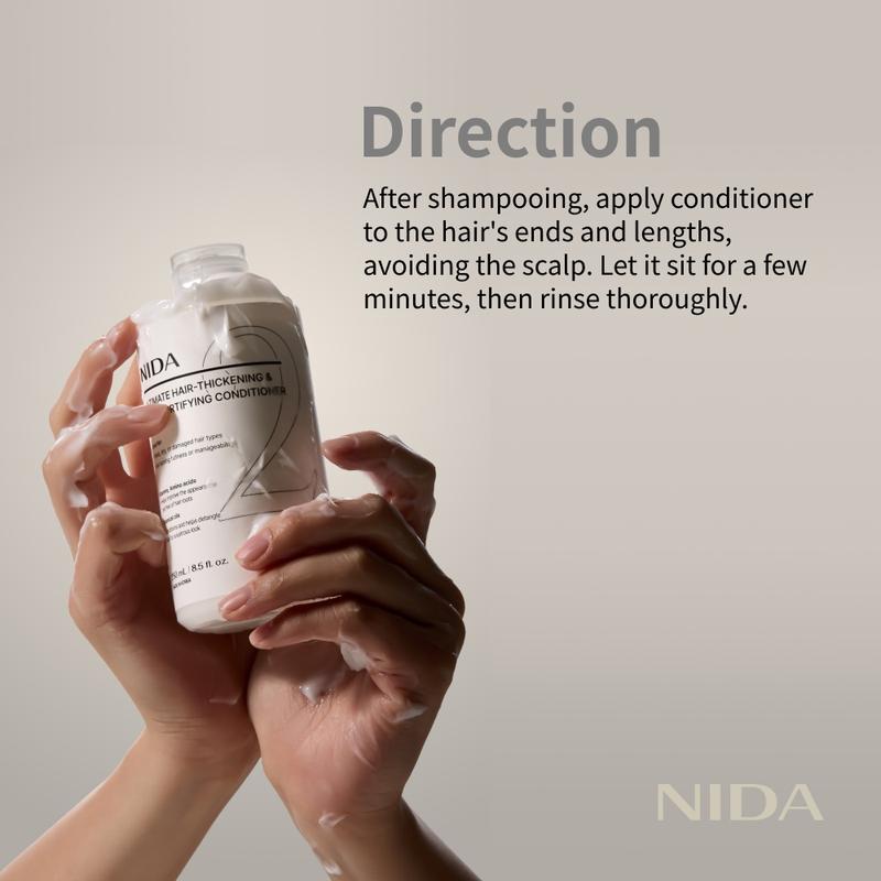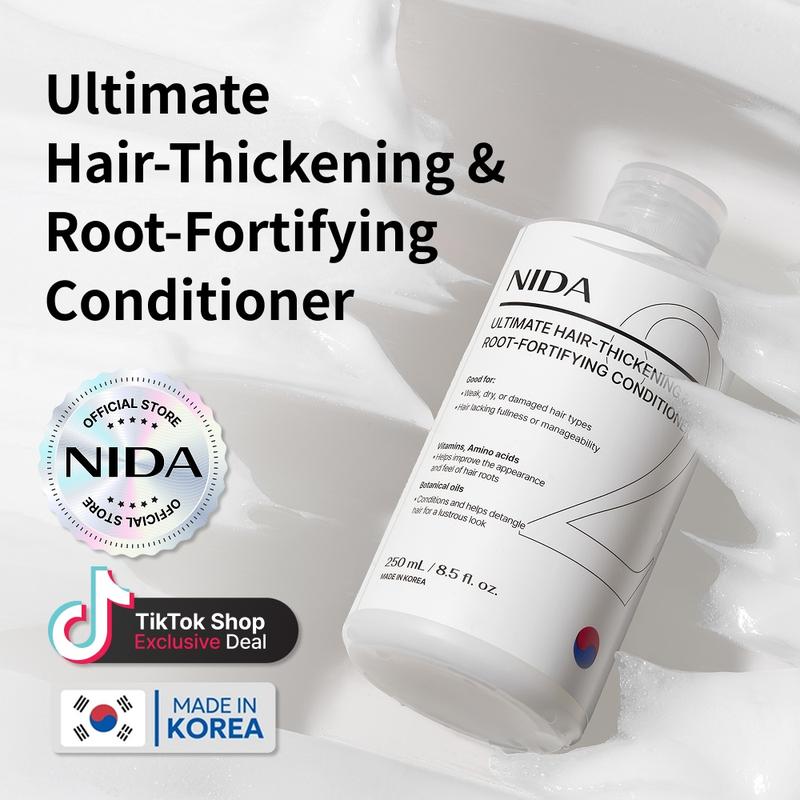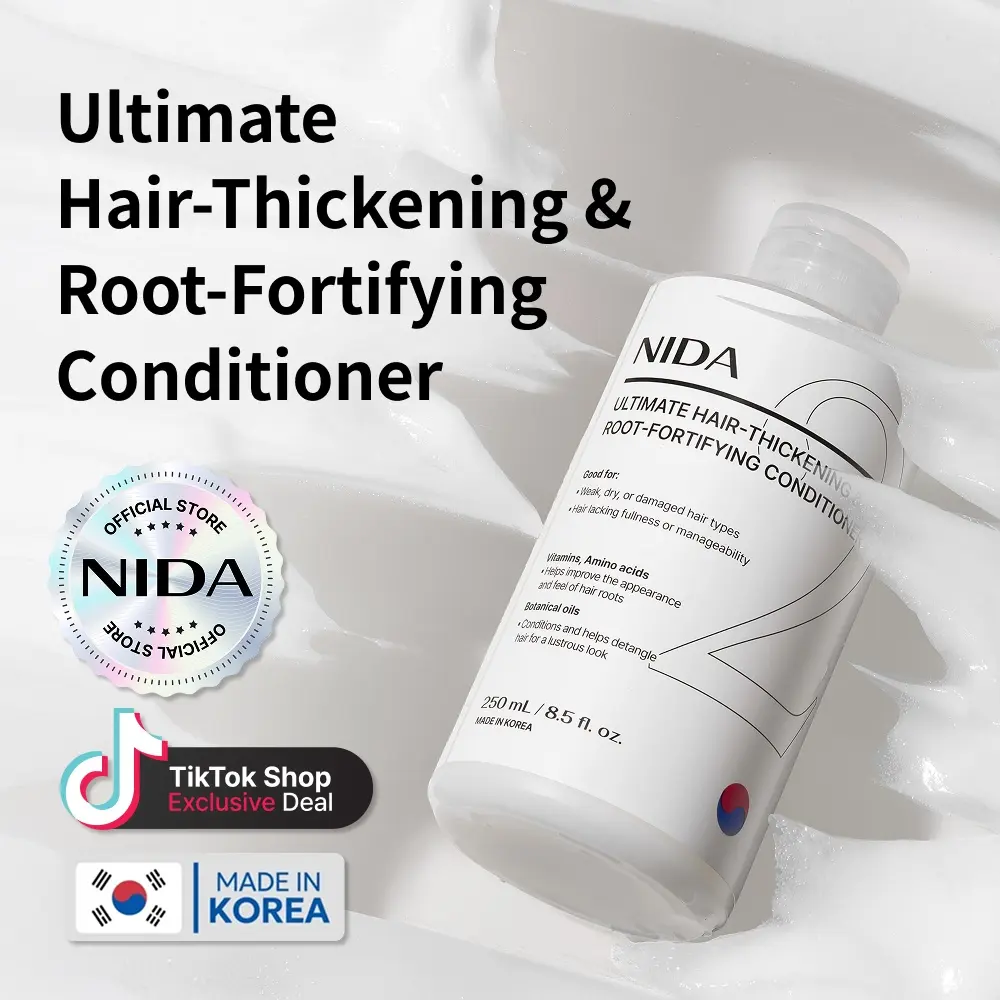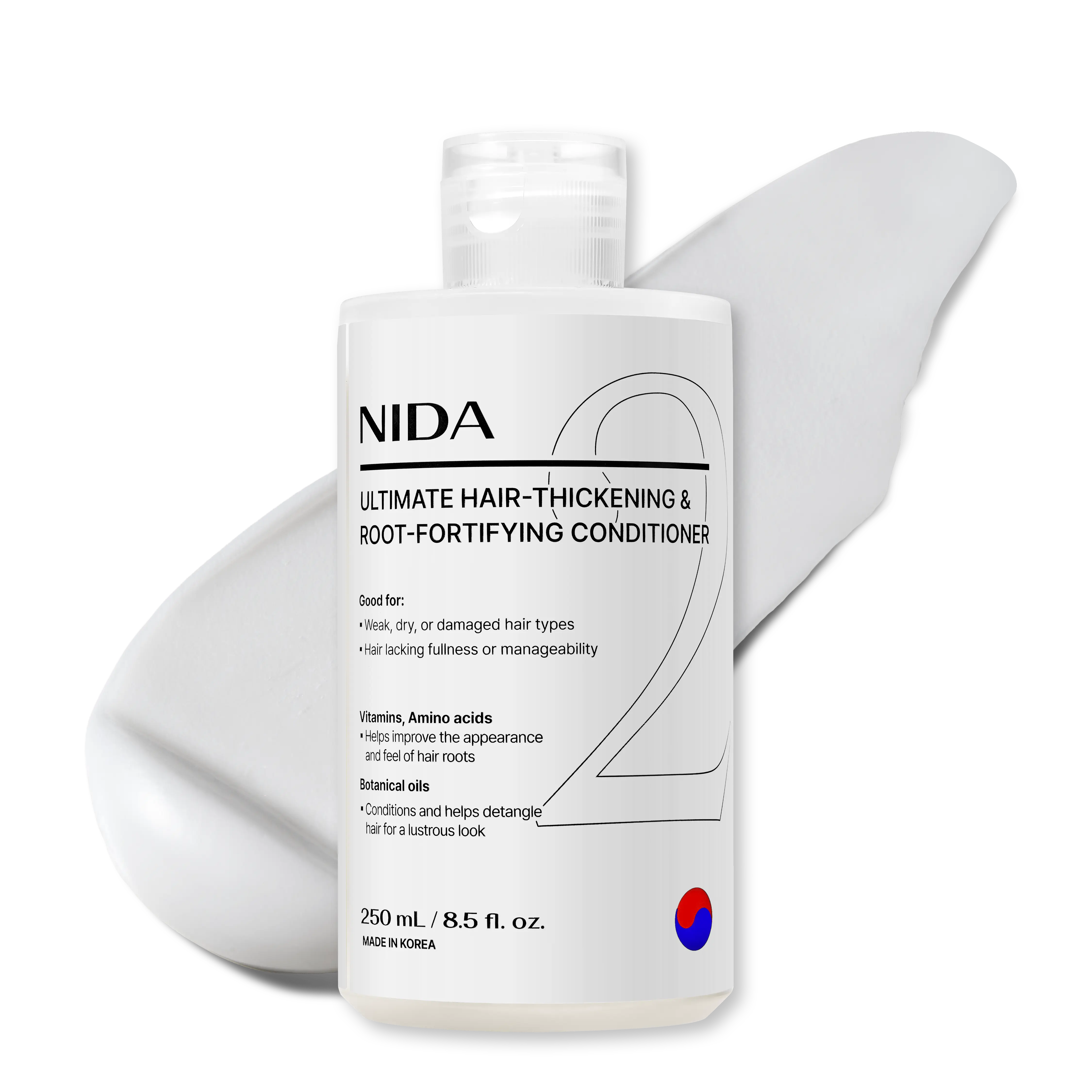 NIDA Ultimate Hair-Thickening & Root-Fortifying Conditioner is the essential second step in your K-Beauty ritual. Engineered for weak and dry hair types, this formula doesn't just coat your strands—it works to visibly enhance fullness and manageability from the root down. It delivers the perfect "slip" for effortless detangling while supporting the appearance of stronger, polished hair.