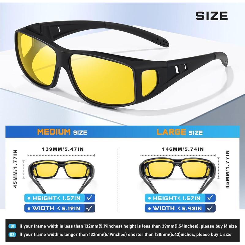 These over-glasses are designed for prescription glasses. They offer an ergonomic wrap-around one-piece design, making them easy to wear over regular glasses like RX or myopia glasses. Suitable for men and women, they provide night vision without prescription glasses.