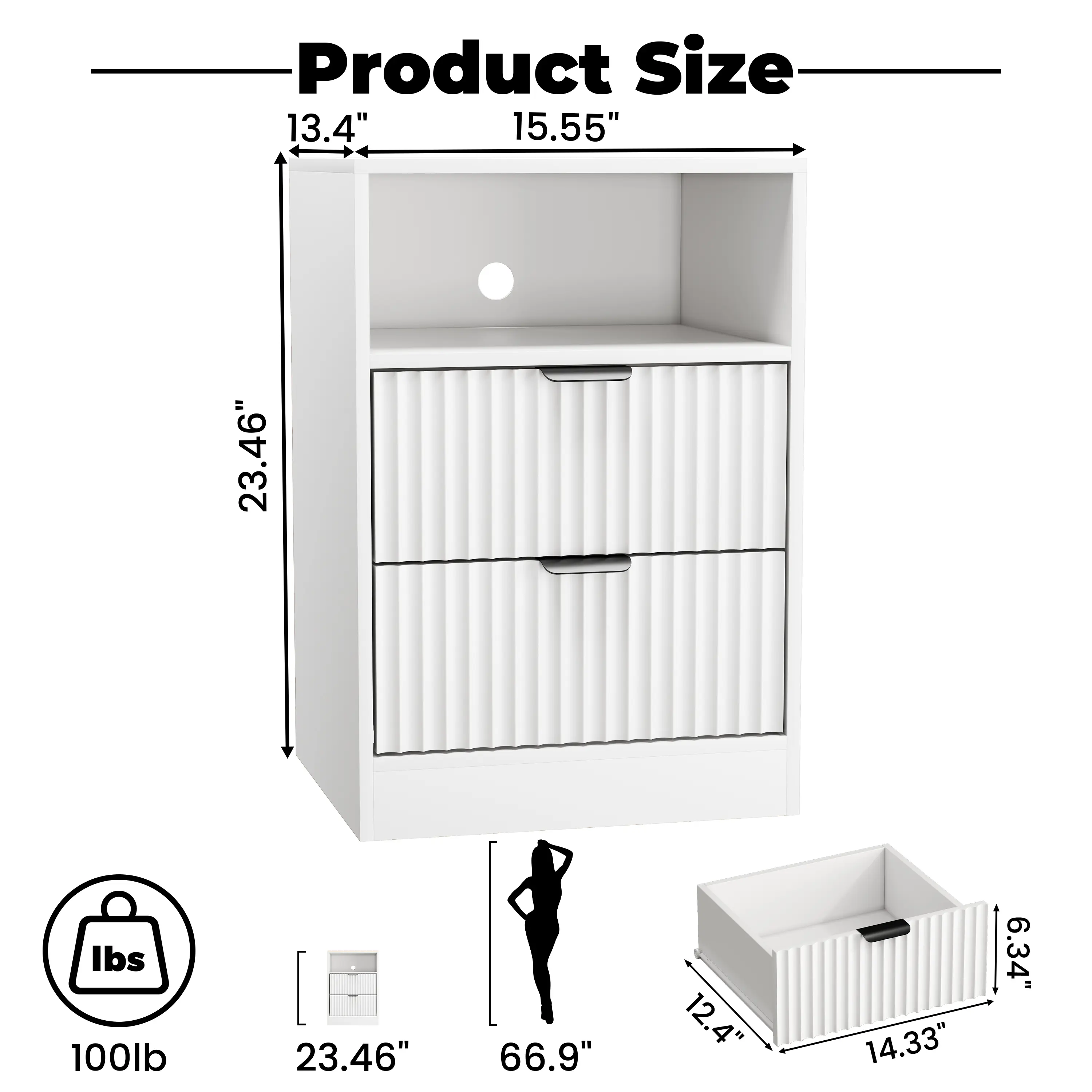 ·【Multi-functional Storage】This modern wood nightstand with 2 drawer and a open space, can easily organize your stuffs. Overall dimensions of the easy assembled night stand is 15.55"W x 20.05"H x 13.39"D. Each drawer of the storage organizer measures 14.3"W x11.8"H x 3.8"D.Deliver efficient storage solutions. Keep your space tidy by conveniently storing clothing, bedding, cosmetics, jewelry, and more. Perfect for bedroom、 living room、 hallway、and entryway.