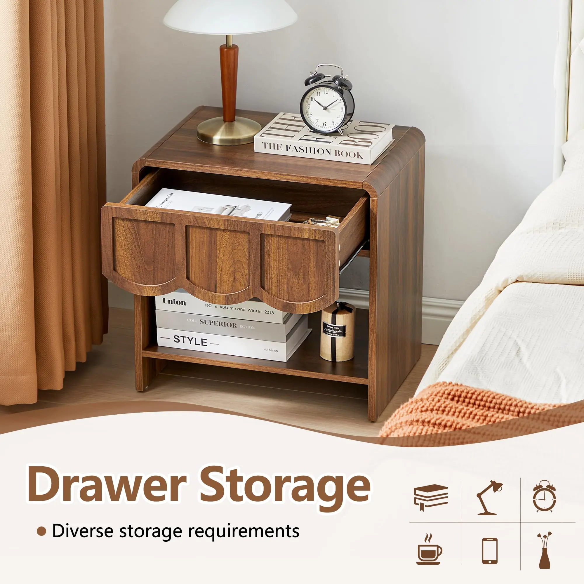 I absolutely love these nightstands! The dark walnut finish is rich and elegant, and the scallop trim adds such a cute, unique touch that makes them stand out from typical designs. They feel sturdy and well made, but still have a charming, stylish look.