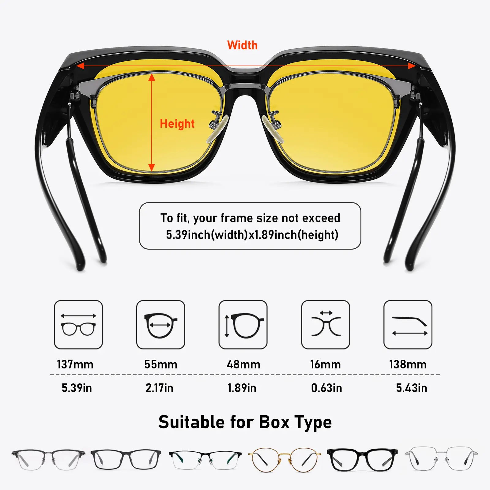 Extremely disappointed in this product. Did not fit over current glasses. No specifications given for product. If you have larger frames do not buy!