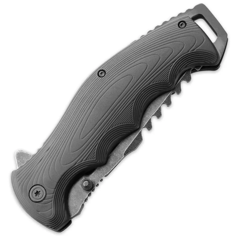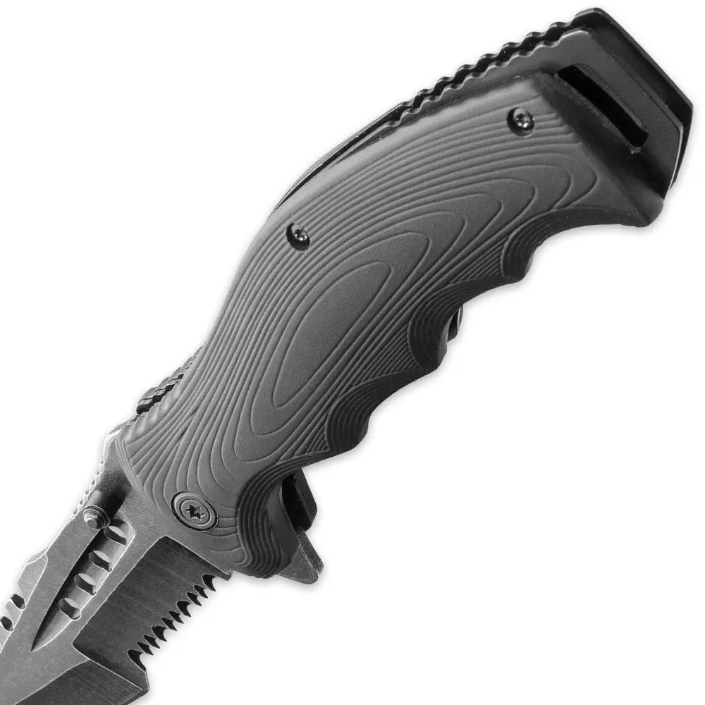 SERRATED BLADE: 3 1/2"" stonewashed stainless steel blade with serrations and cut-outs for style and utility.ASSISTED OPENING: Quick-action opening with thumb stud or flipper for fast, one-handed use.LIGHTWEIGHT HANDLE: Durable ABS construction provides strength with a comfortable grip.SECURE CARRY: Black stainless steel pocket clip ensures dependable portability.COMPACT SIZE: 8 1/4"" overall with a 4 3/4"" closed length for everyday convenience.