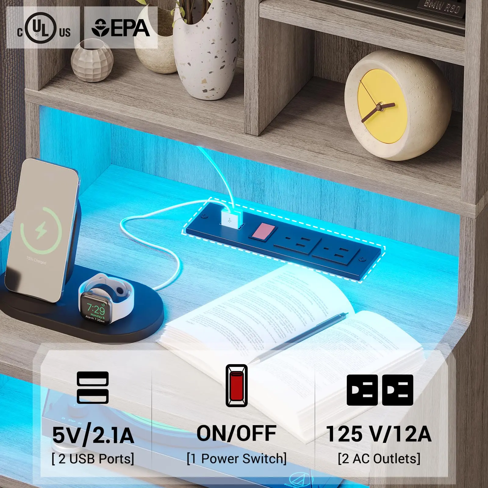 Sikaic Tall Nightstand with Charging Station and LED Lights, Bedside Table with Bookshelf, Grey Furniture Bedroom Vanity Desk Design Vanity DeskSikaic Tall Nightstand with Charging Station and LED Lights, Bedside Table with Bookshelf, Grey Furniture Bedroom Vanity Desk Design Vanity DeskSikaic Tall Nightstand with Charging Station and LED Lights, Bedside Table with Bookshelf, Grey Furniture Bedroom Vanity Desk Design Vanity Desk