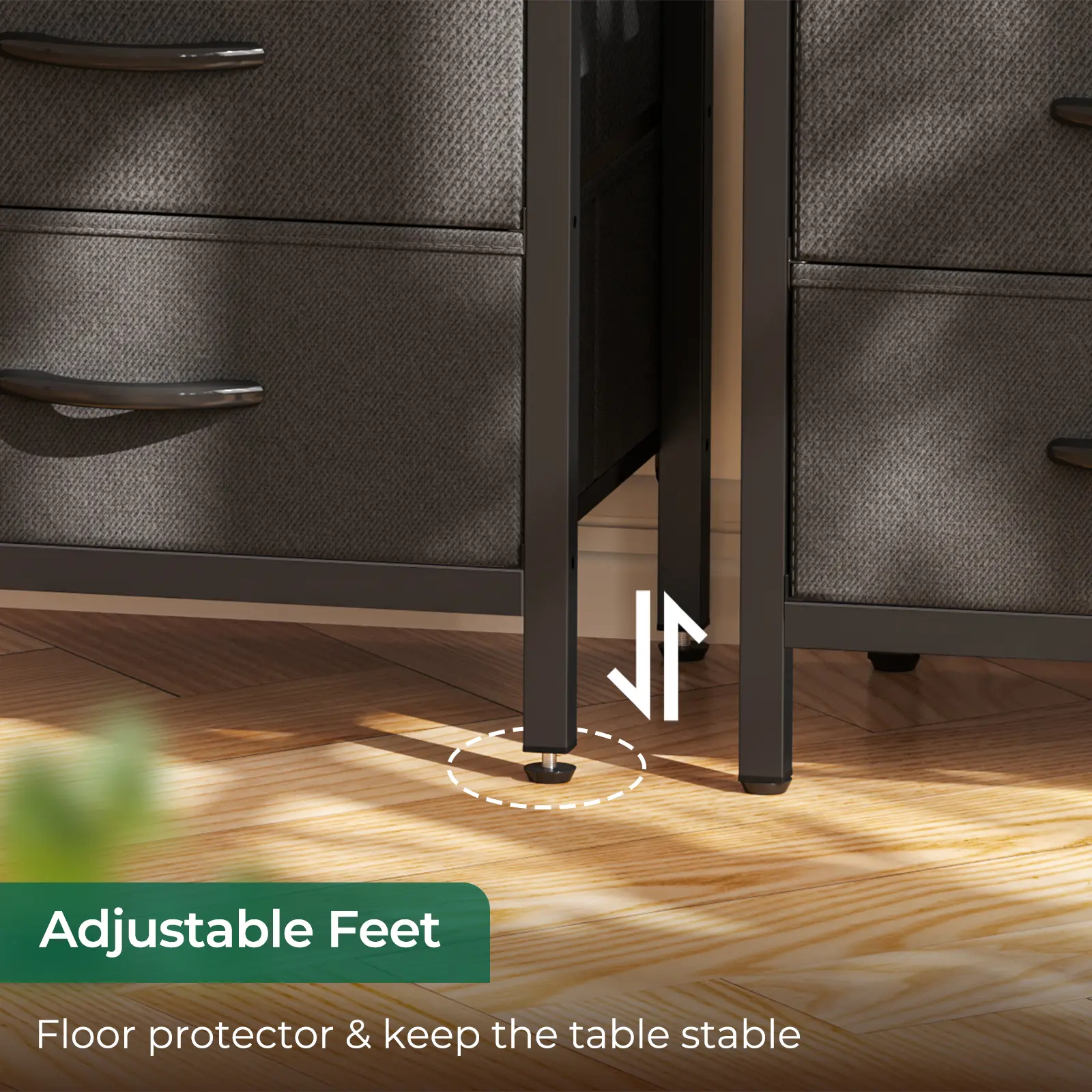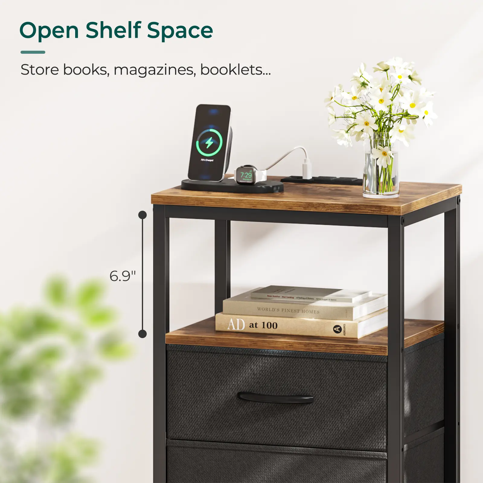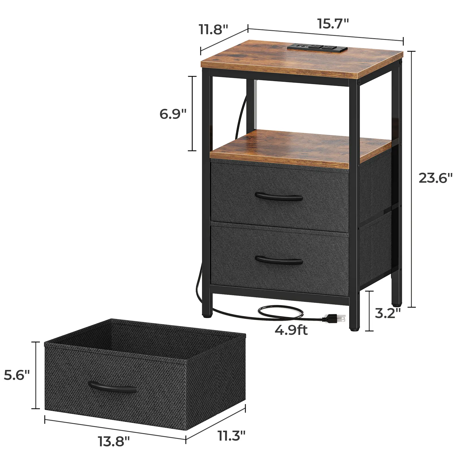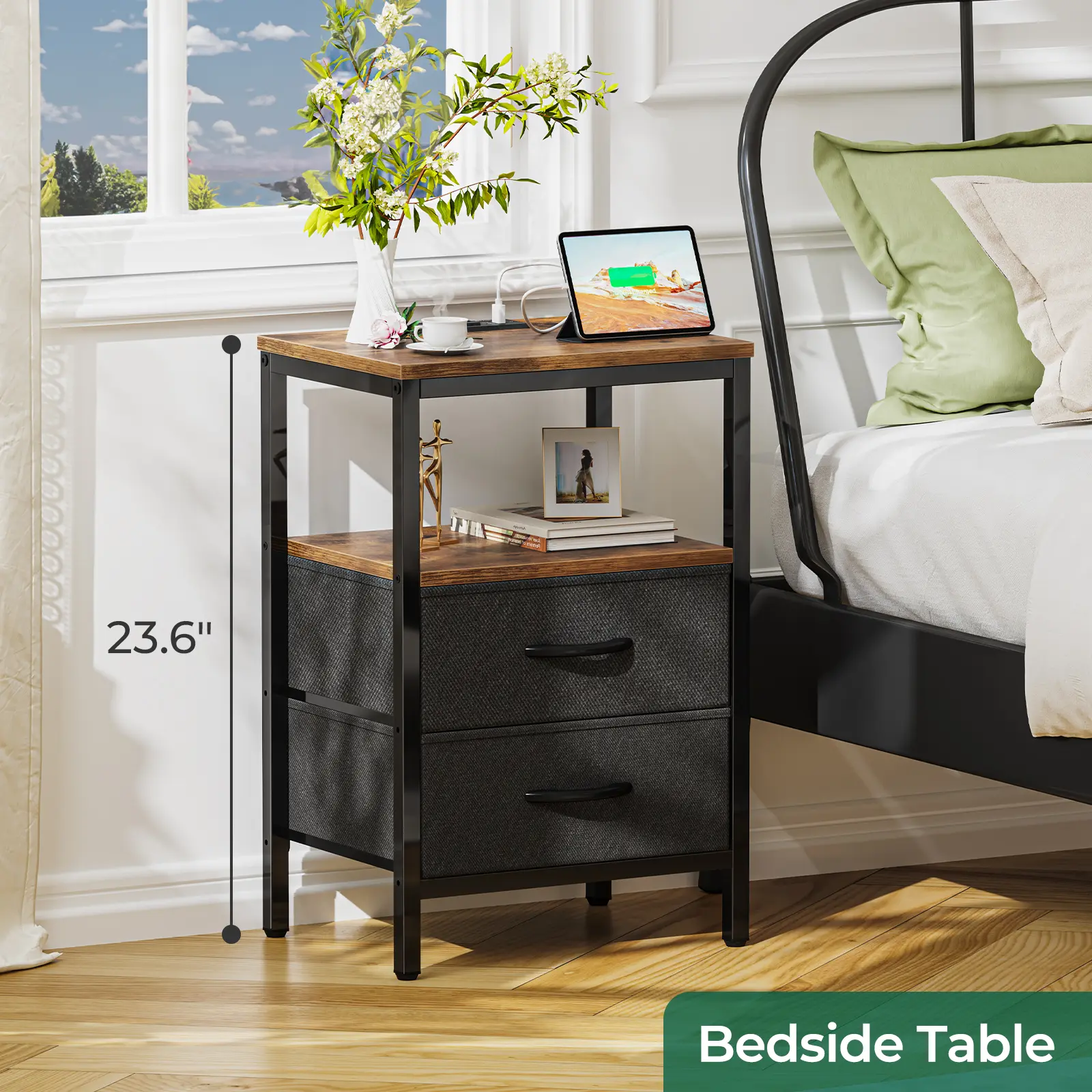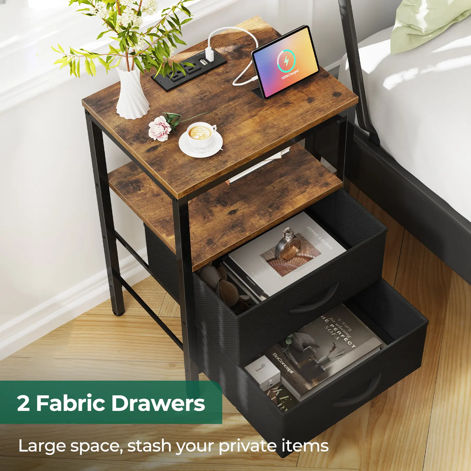 Enjoy a clutter-free bedside space with our charging nightstand. 2 fabric drawers store your bedside and sofa side items well and protect your privacy. Powder-coated metal frame and durable particle board ensure a robust structure.