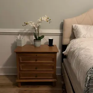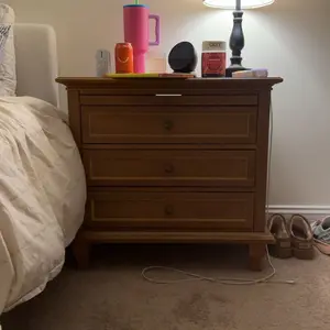 I love this nightstand. It wasn’t super easy to put together but it’s sturdy and I love it so much! I can make it look clean quickly with cords and it doubles as a bedside table and side workspace.