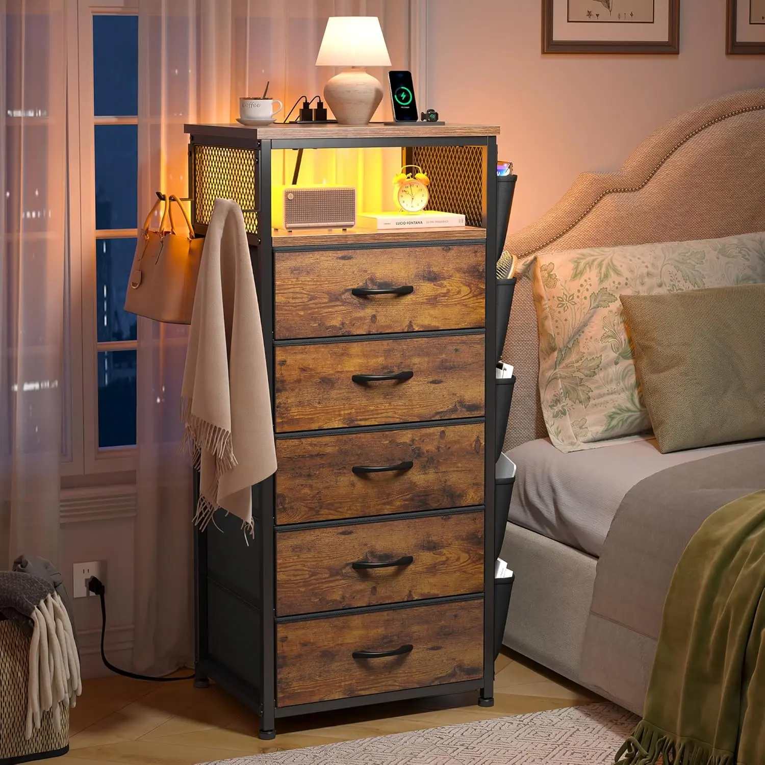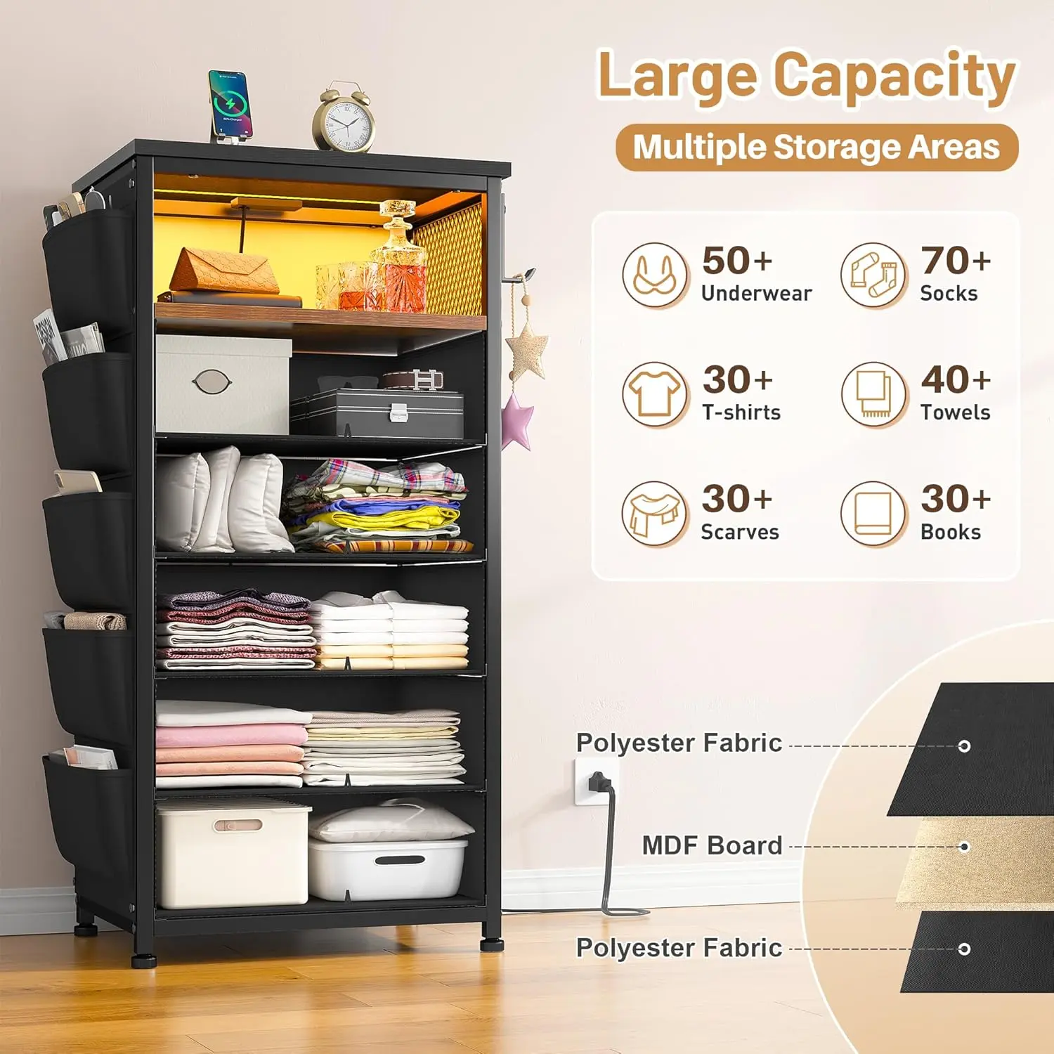 ·【Nightstand with Outlets & LED Lights】Equipped with USB ports and 2 AC outlets, our dresser for bedroom ensures your devices are always powered up. Built-in outlets prioritize safety, eliminating worries of spills causing electrical hazards. Bedside table featuring 20 RGB LED colors to gently illuminate your space, perfect for those midnight wake-ups.