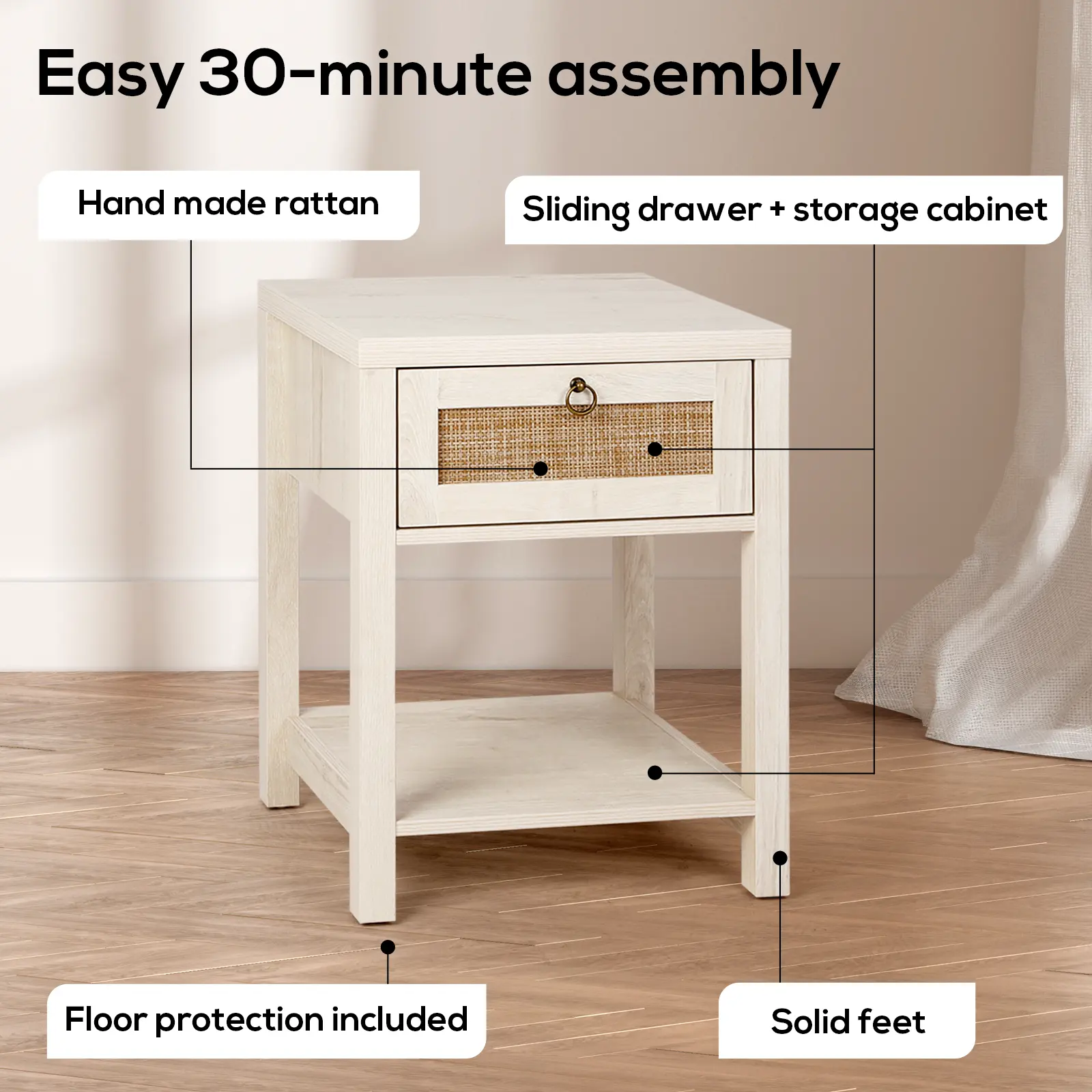 This nightstand kit is easy to assemble and comes with all the necessary hardware and can usually be set up in less than 30 minutes.