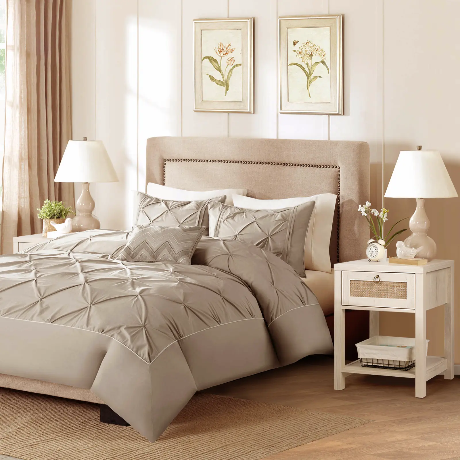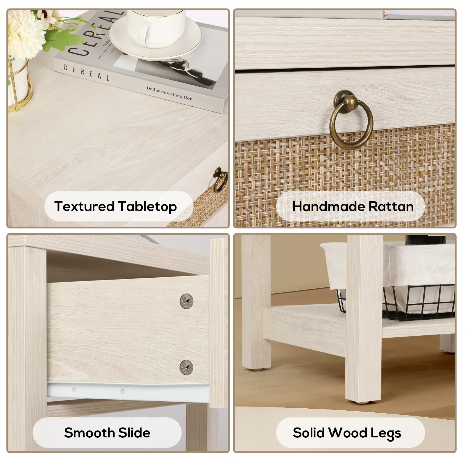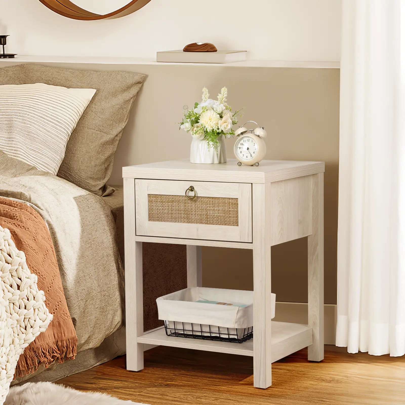 This rattan nightstand set features an eye-catching woven texture that adds a touch of bohemian charm. The rattan-accented drawer fronts with vintage metal pulls are perfect for farmhouse, coastal or bohemian-themed interiors.