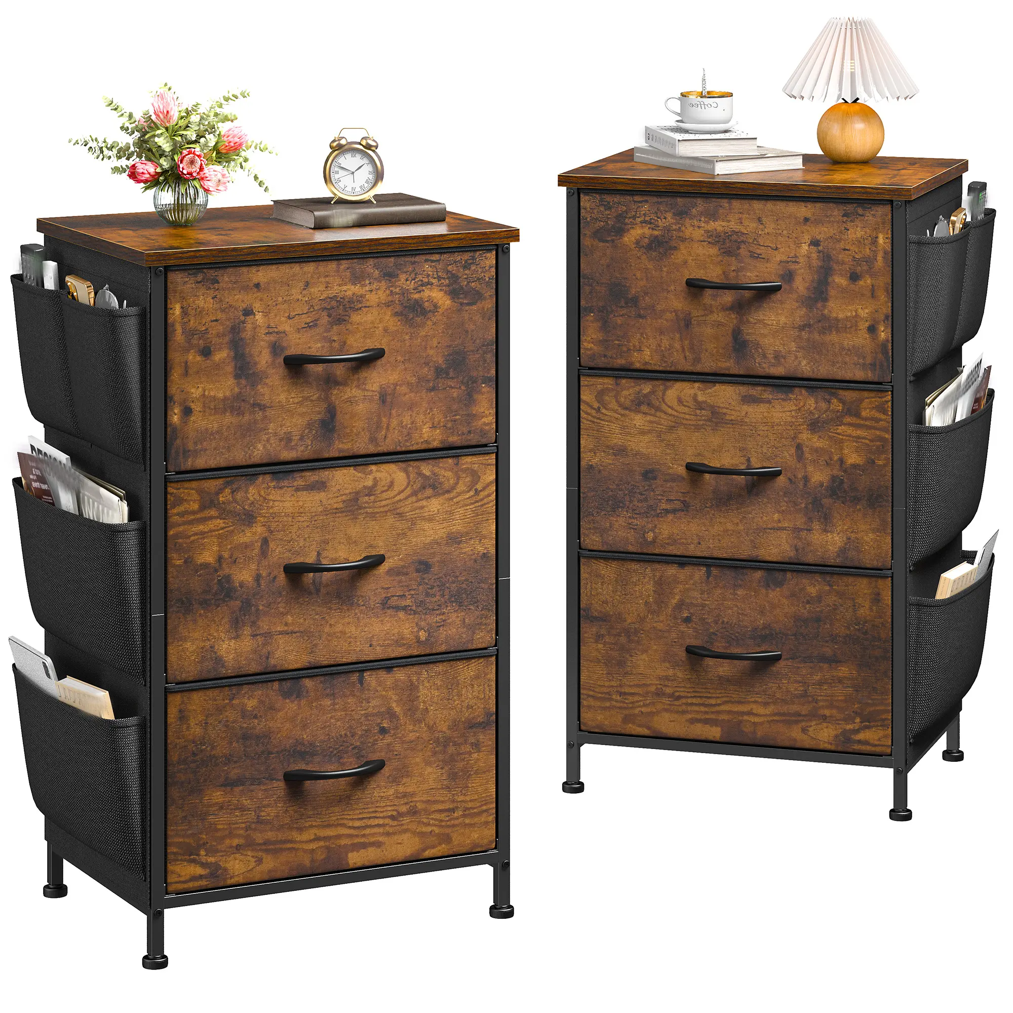 ·【Stability & Durability】Constructed with high-quality wood panels, square steel supports, and a reinforced X-back steel frame, this nightstand delivers exceptional strength. Adjustable feet enhance stability and protect floors from scratches. Upgraded handles and smooth slides ensure effortless drawer access. The sturdy frame combined with durable, waterproof, and wear-resistant non-woven fabric drawers guarantees years of reliable bedroom use.
