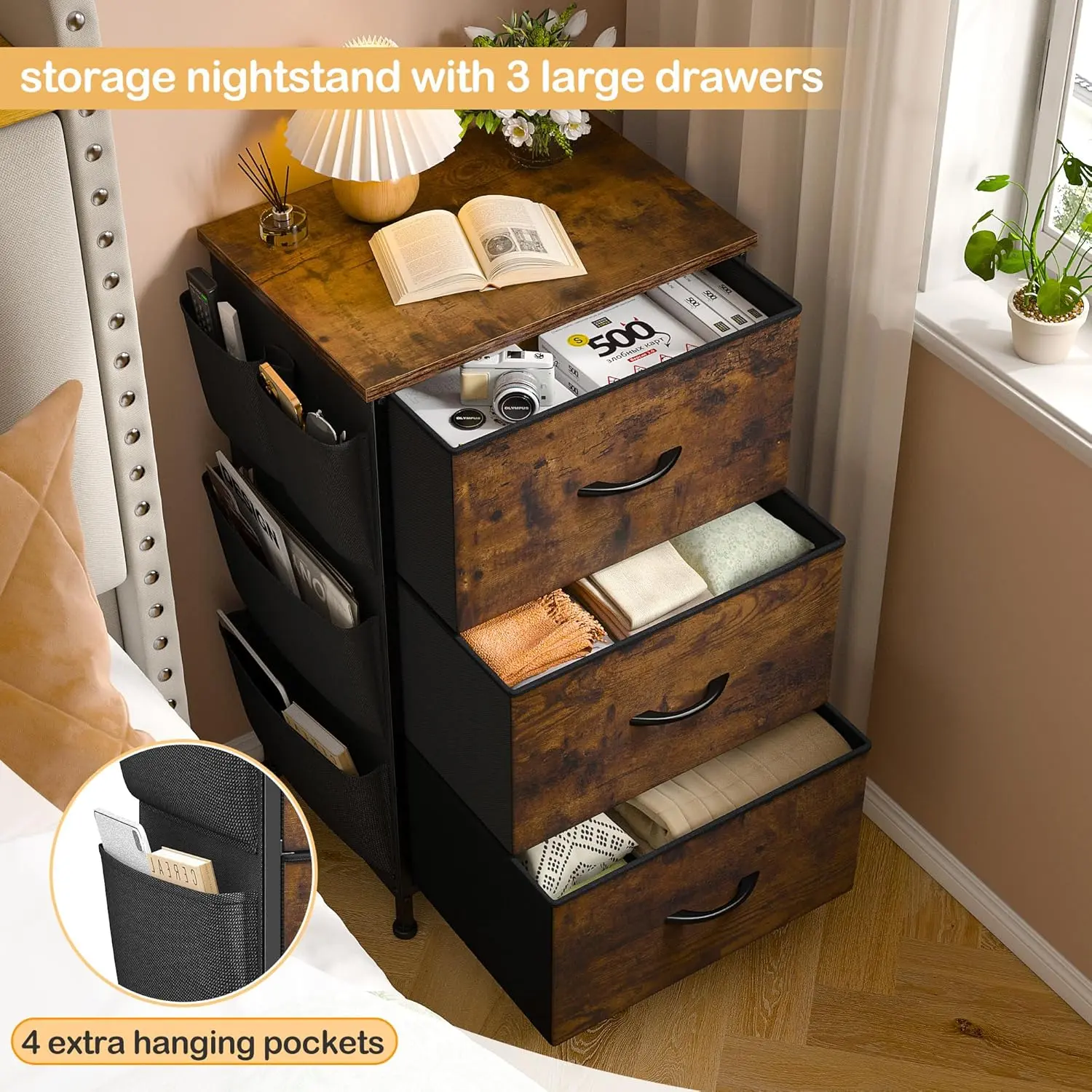 ·【Versatile Nightstand】 Measuring 15.7" wide x 11.8" deep x 25.6" high, this lightweight nightstand features 3 durable fabric drawers and 4 hanging bags for organized storage of clothes, accessories, or personal items. Sturdy enough to hold up to 66 lbs, it's easy to move and ideal as a nightstand, side table, home office cabinet, or closet organizer.