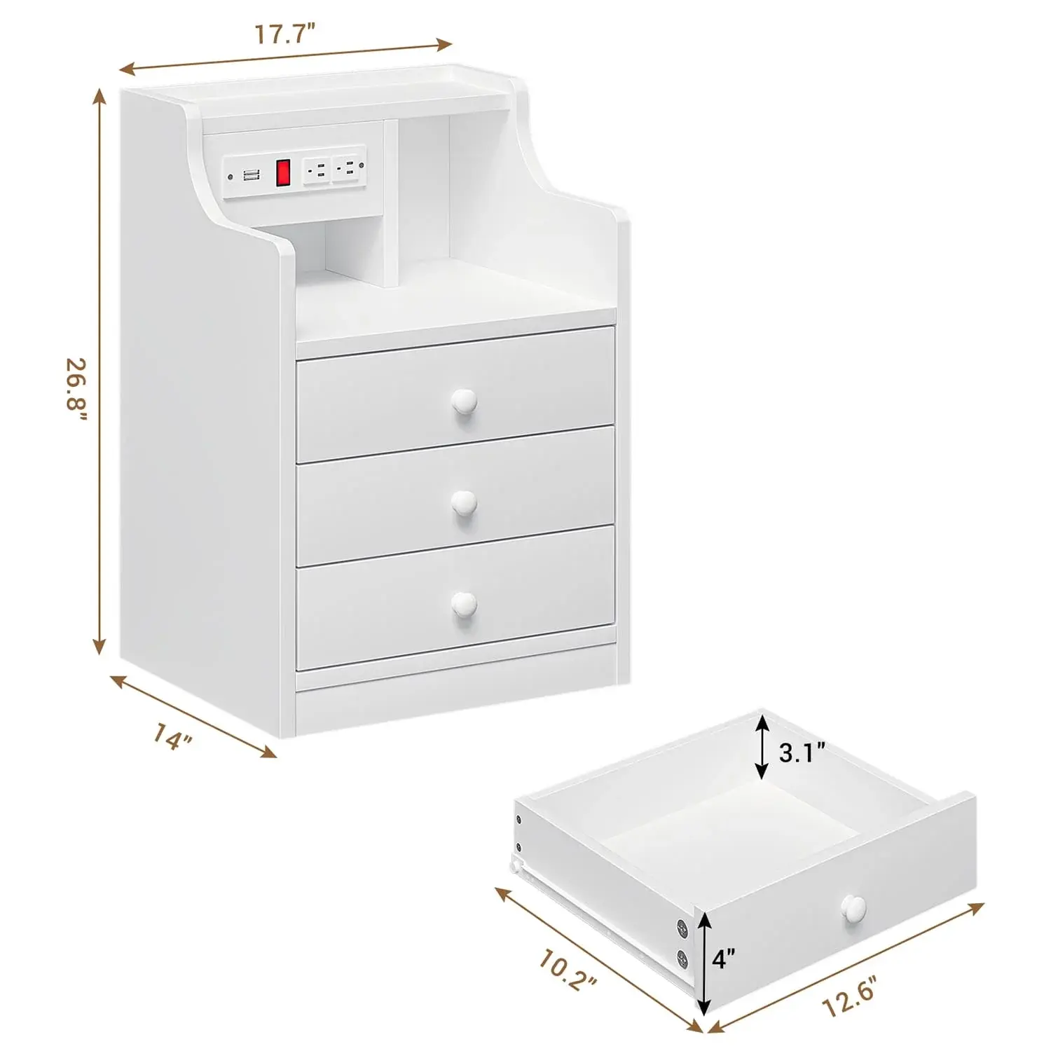 Elevate your bedroom with this modern nightstand by Sikaic. This bedside cabinet features a sleek white finish and a contemporary design. It includes a charging station with power outlets and USB ports, ensuring convenience. The nightstand measures 14"D x 17.7"W x 26.8"H, offering ample storage with three drawers. Perfect for modern accents, this table design combines functionality and style.
