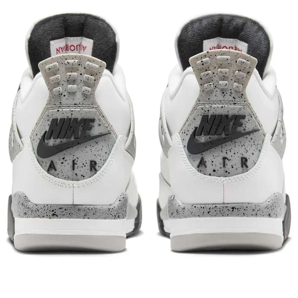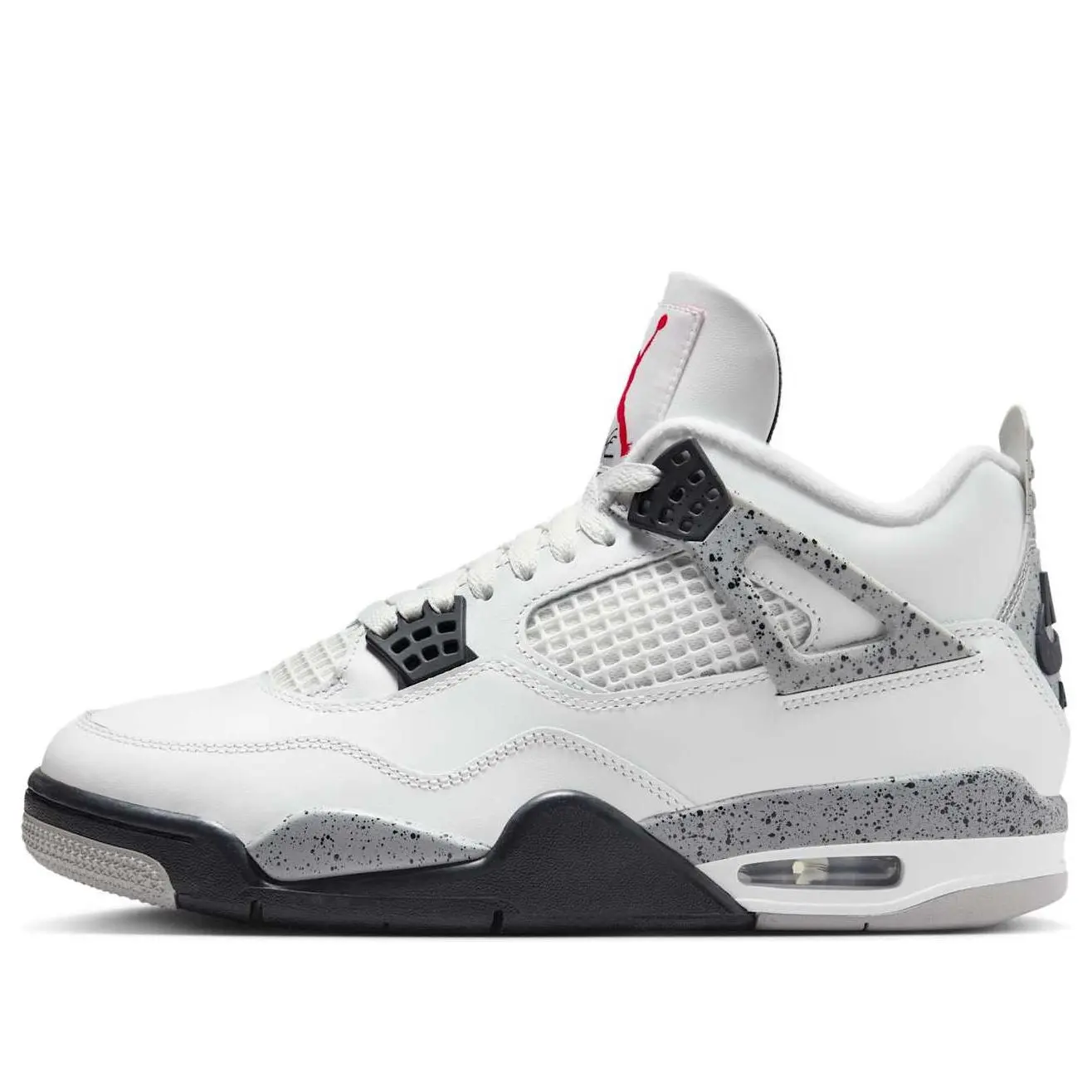 The iconic Air Jordan 4 "White Cement," a 1989 OG, returns in 2025. This highly anticipated release features a crisp white leather upper, grey speckled midsole, and signature black accents. Boasting original Nike Air branding and visible Air cushioning, it's a must-have for collectors and sneakerheads alike.