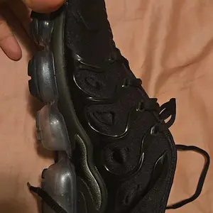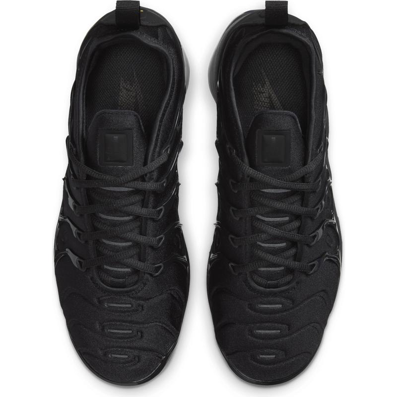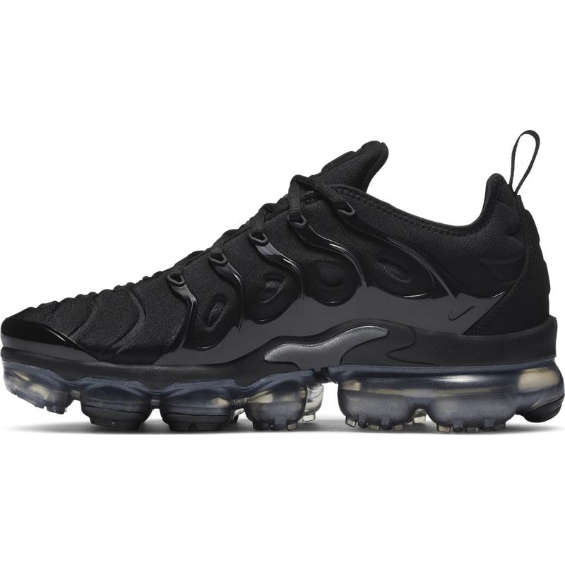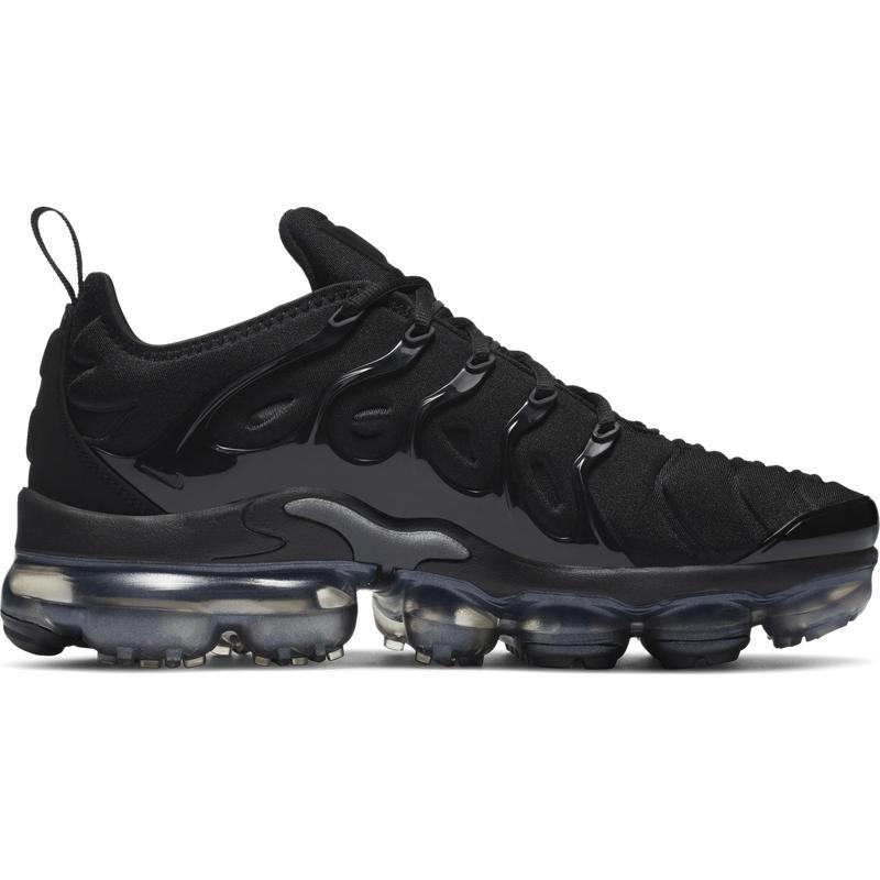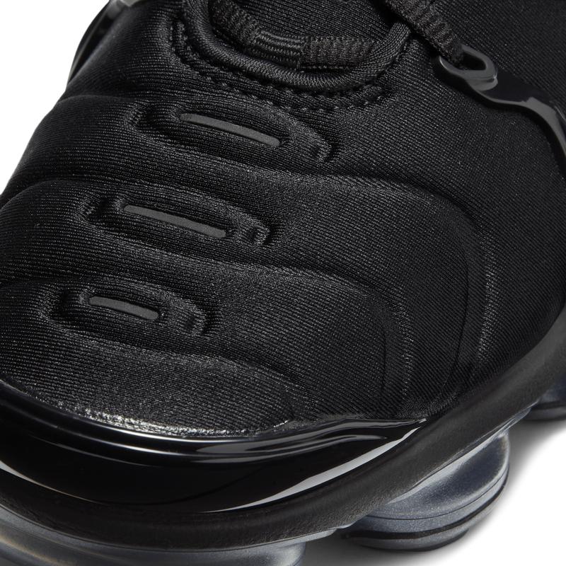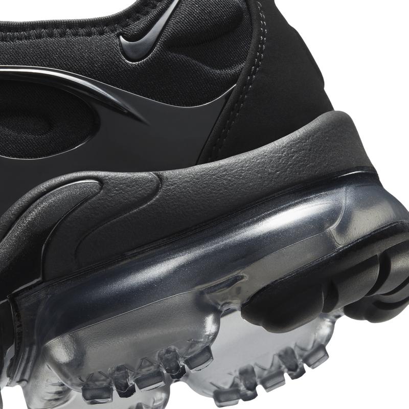 The Nike Air VaporMax Plus looks to the past and propels you into the future. Made with at least 20% recycled material by weight, it keeps the future in mind while including design elements from the '98 Air Max Plus. Revolutionary VaporMax Air technology provides comfort and a modern look, while the floating cage, heel logo, and iconic whale tail midfoot shank add heritage style. A sleek all-black upper and black rubber pods on the outsole show off your dark side.