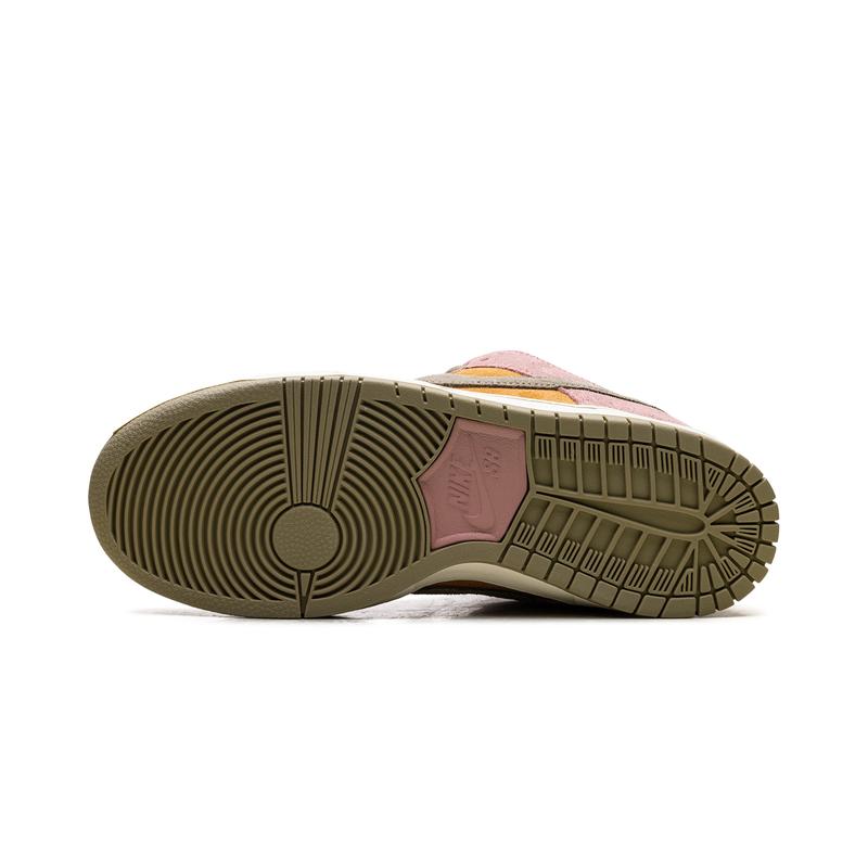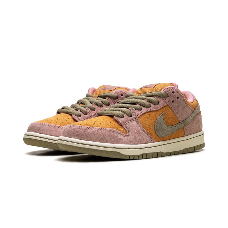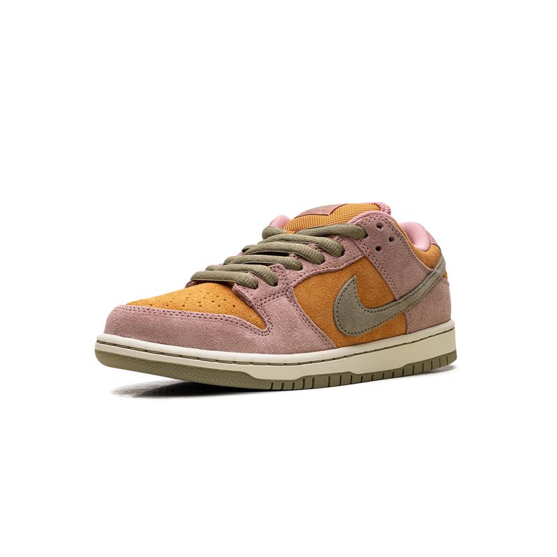 The Nike Dunk Low SB 'Red Stardust' (HJ4135 600) has a muted orange suede upper with contrasting pink overlays and a light olive Swoosh. The Nike SB logo decorates the tongue tag and insoles, equipped with a Zoom Air heel unit.
