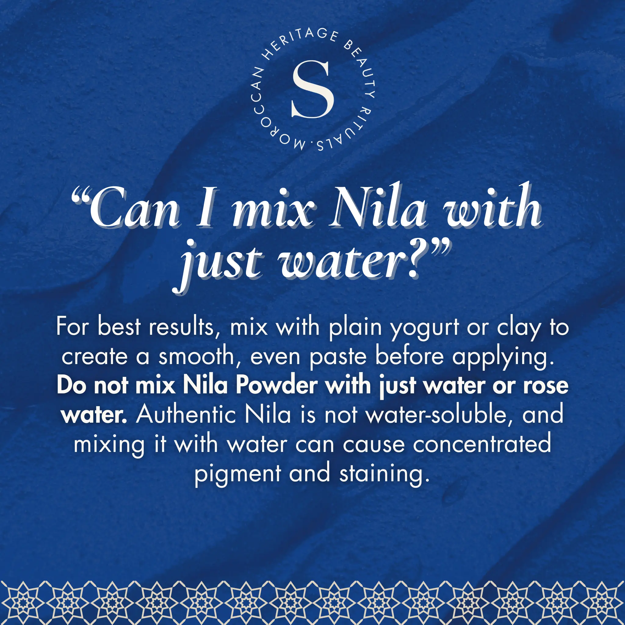 As a skin mask: Β Mix 2 tablespoons of either natural yogurt or a clay mask with for ΒΌ to Β½ teaspoons of Nila. Avoid adding more, as a little goes a long way! Optionally, add a few drops ofΒ argan oil. Apply to face and body and wait 5-15 minutes before rinsing with water. Repeat this process 1-2 times per week. Moisturize when finished.