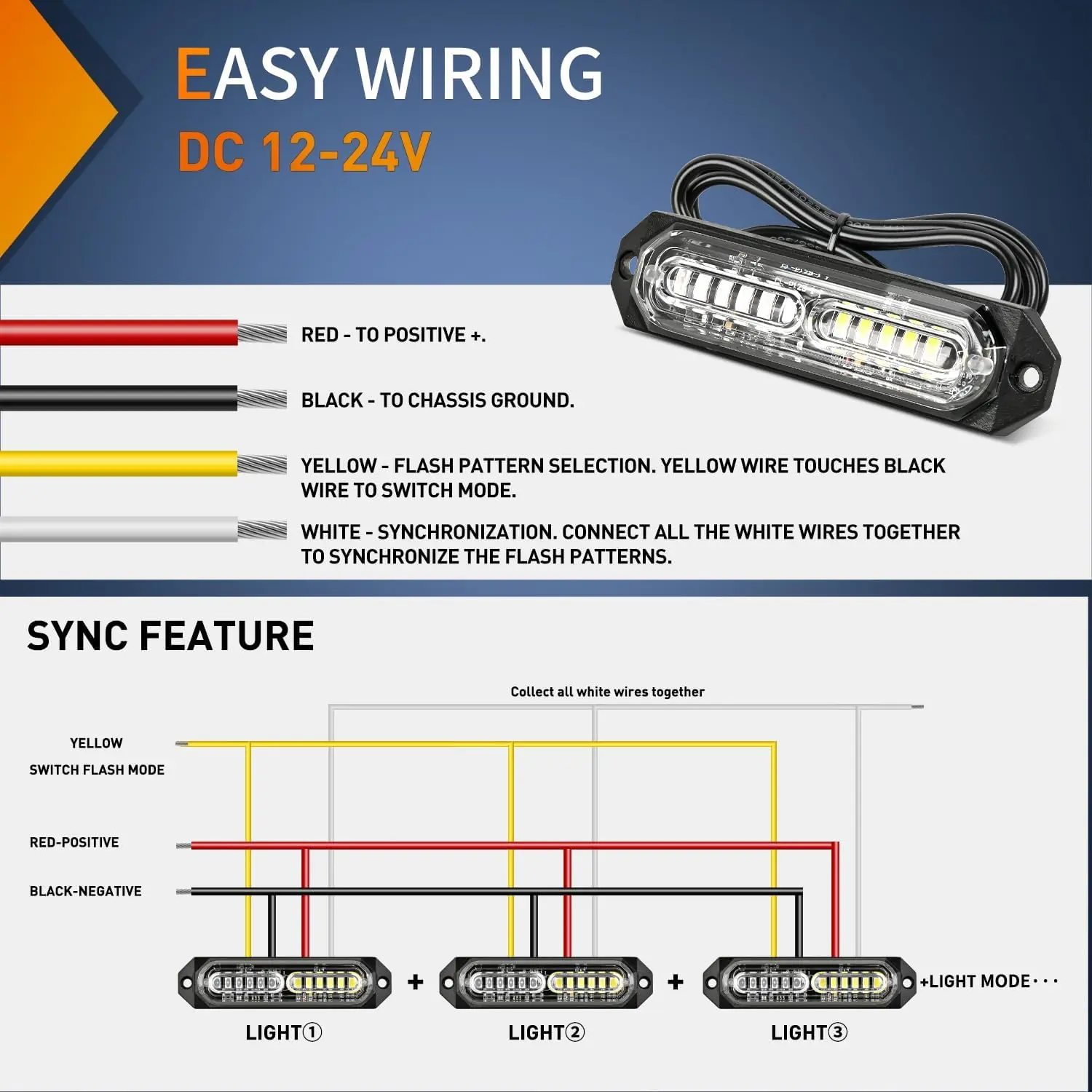 ·Easy wiring: RED -- +VDC. BLACK --Chassis Ground. WHITE-- Sync, If sync is required, just connect the white wires of all lights together. YELLOW -- Pattern Selection, yellow wire touches black wire for 1-2 seconds to change different flashing modes
