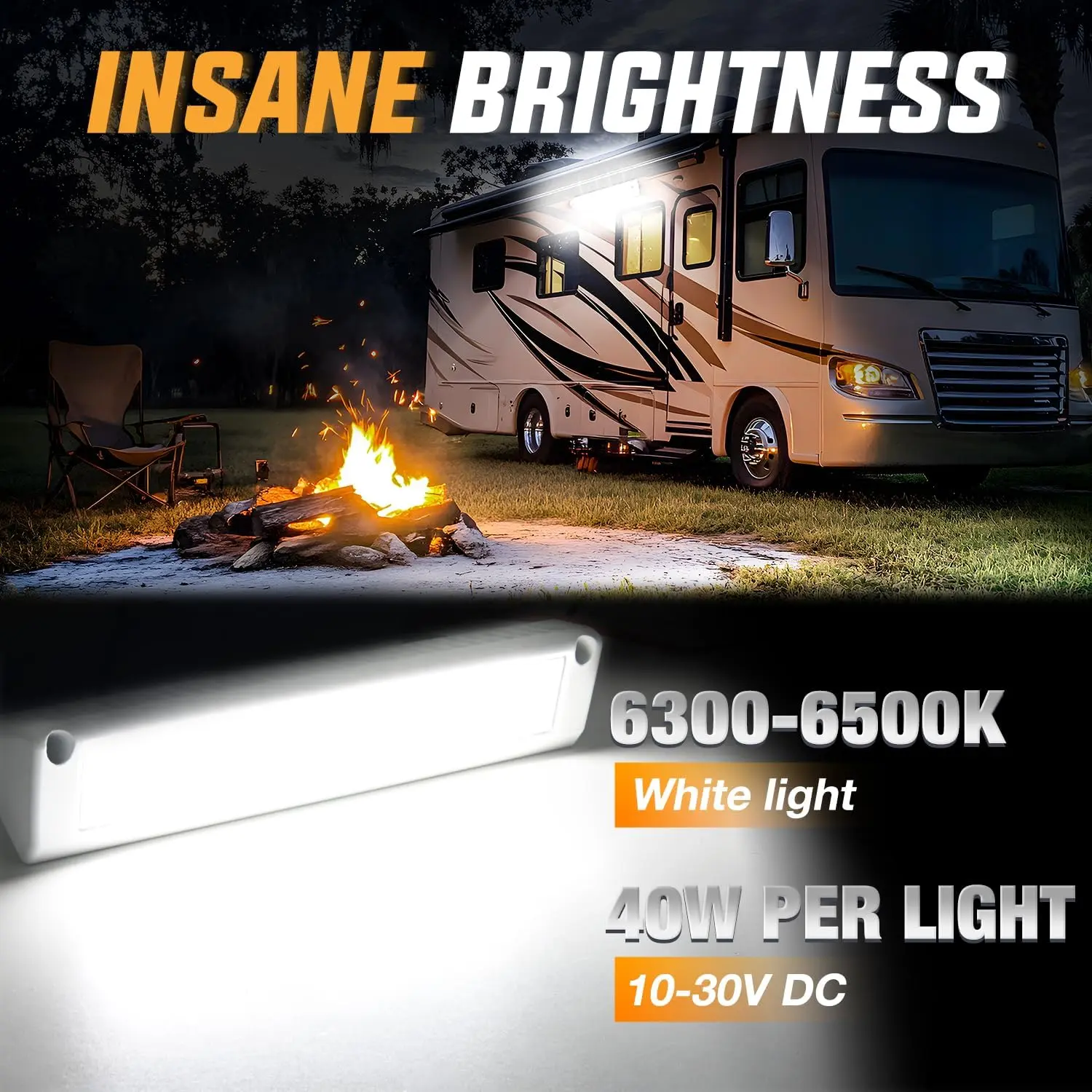 ·Excellent Lighting Performance: 40W per light, a combination of 60 pcs SMD LED chips emit 6300-6500K bright white light. With an anti-glare PC lens, the floodlight is soft and widely spread on the side of your RV, bright enough without making people dizzy or uncomfortable, it is an ideal choice for outdoor camping lights