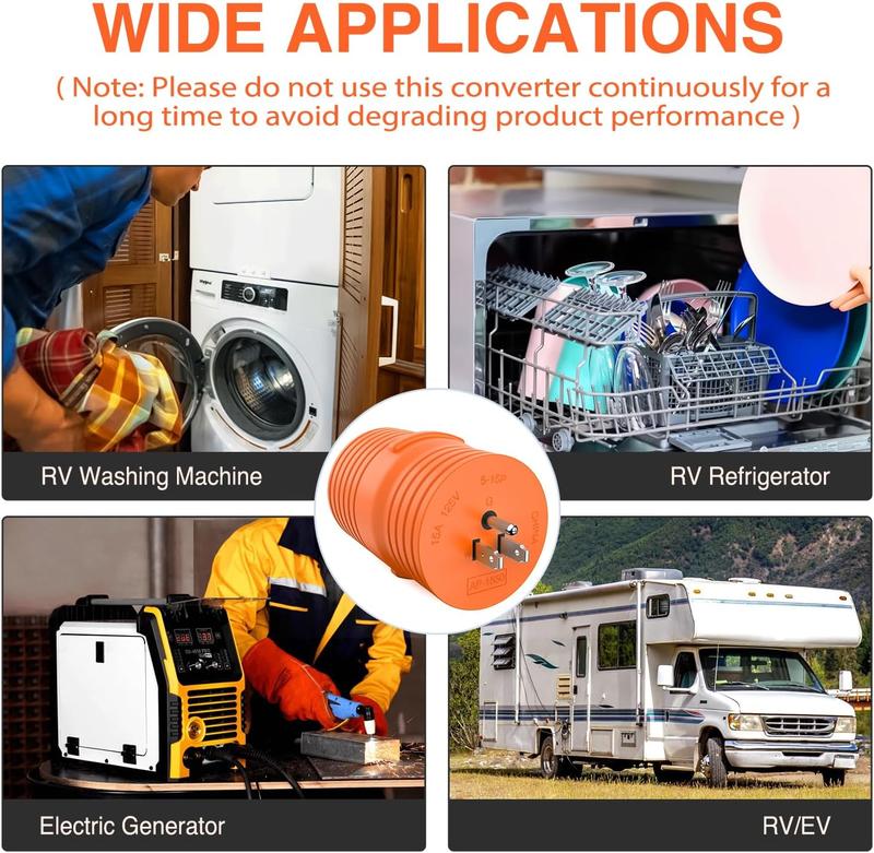 ·15 to 50 Amp Adapter: Adapter NEMA 5-15P to NEMA 14-50R. Allows you to connect on the 15 AMP external receptacle at RV Park or Campground to a 50 AMP service on your RV, which quickly supplies power for the refrigerator, air conditioner, microwave oven, roaster and other household appliances.