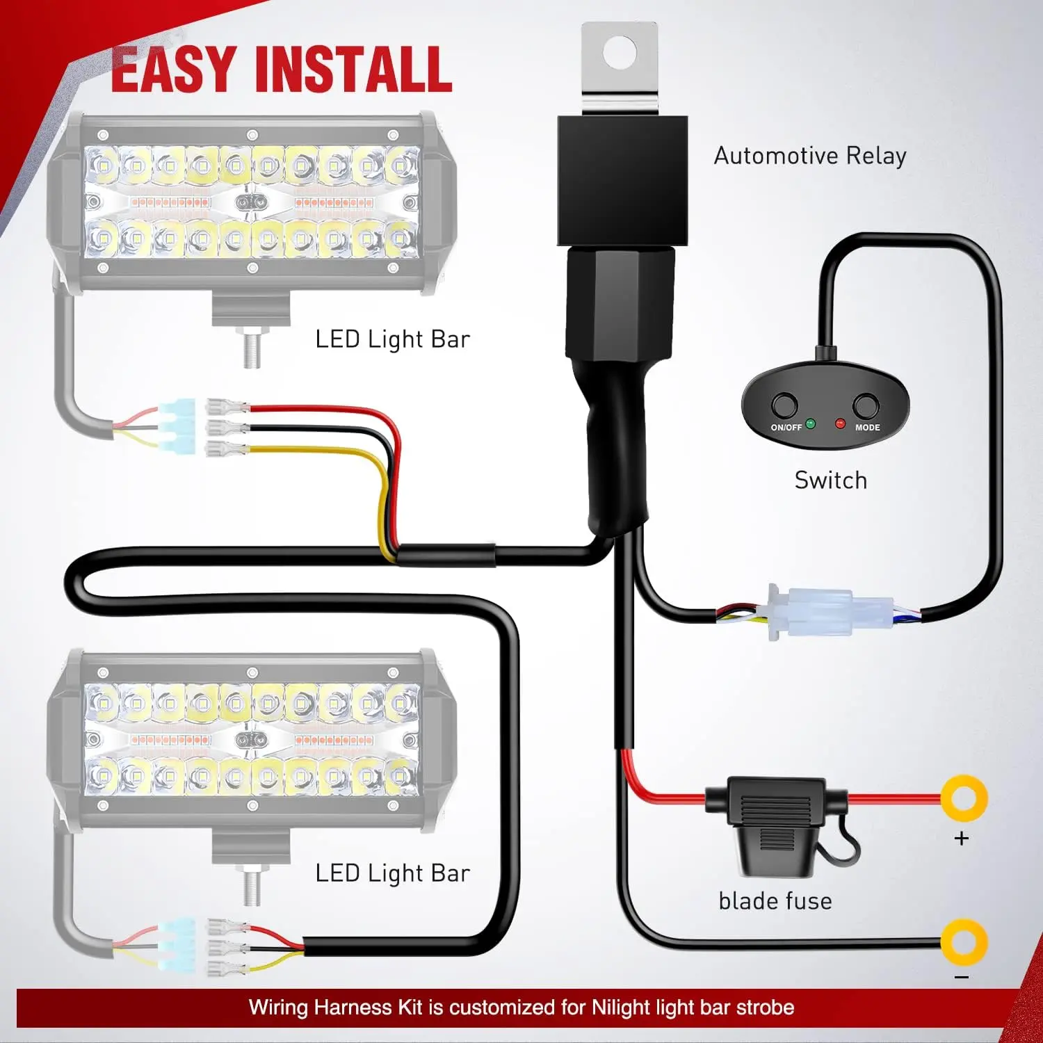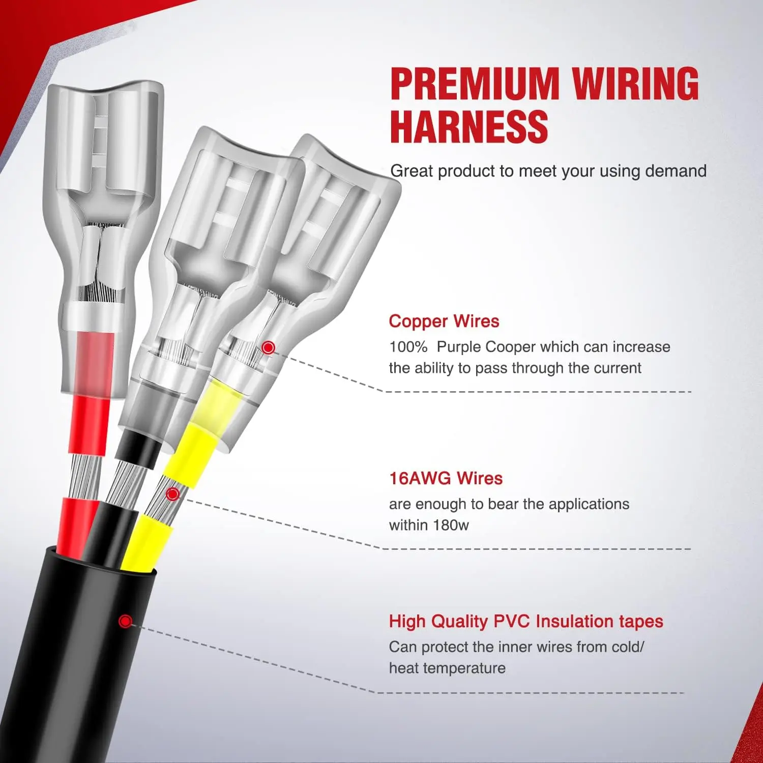 With two sets of light output connectors, the wiring harness can hook up two LED lights within 180W at the same time.