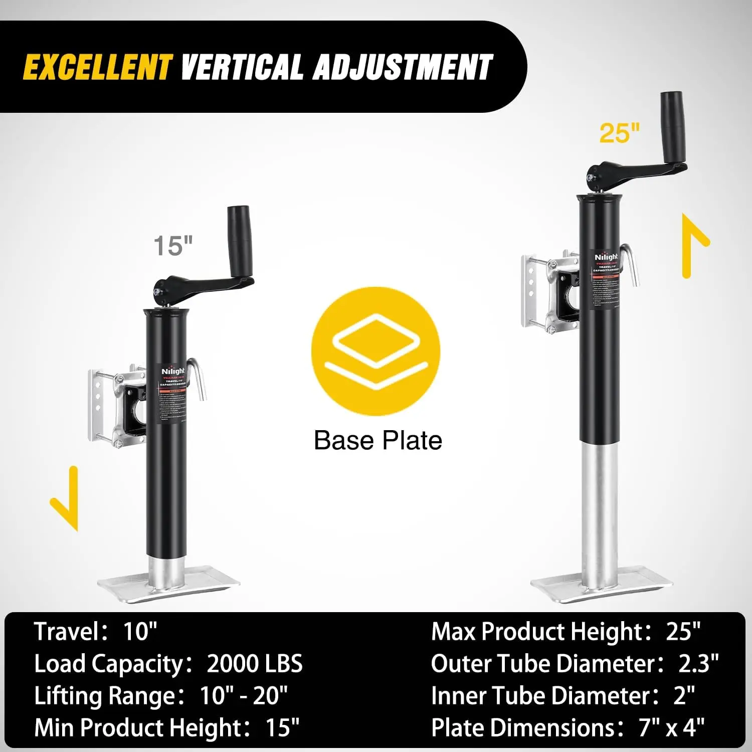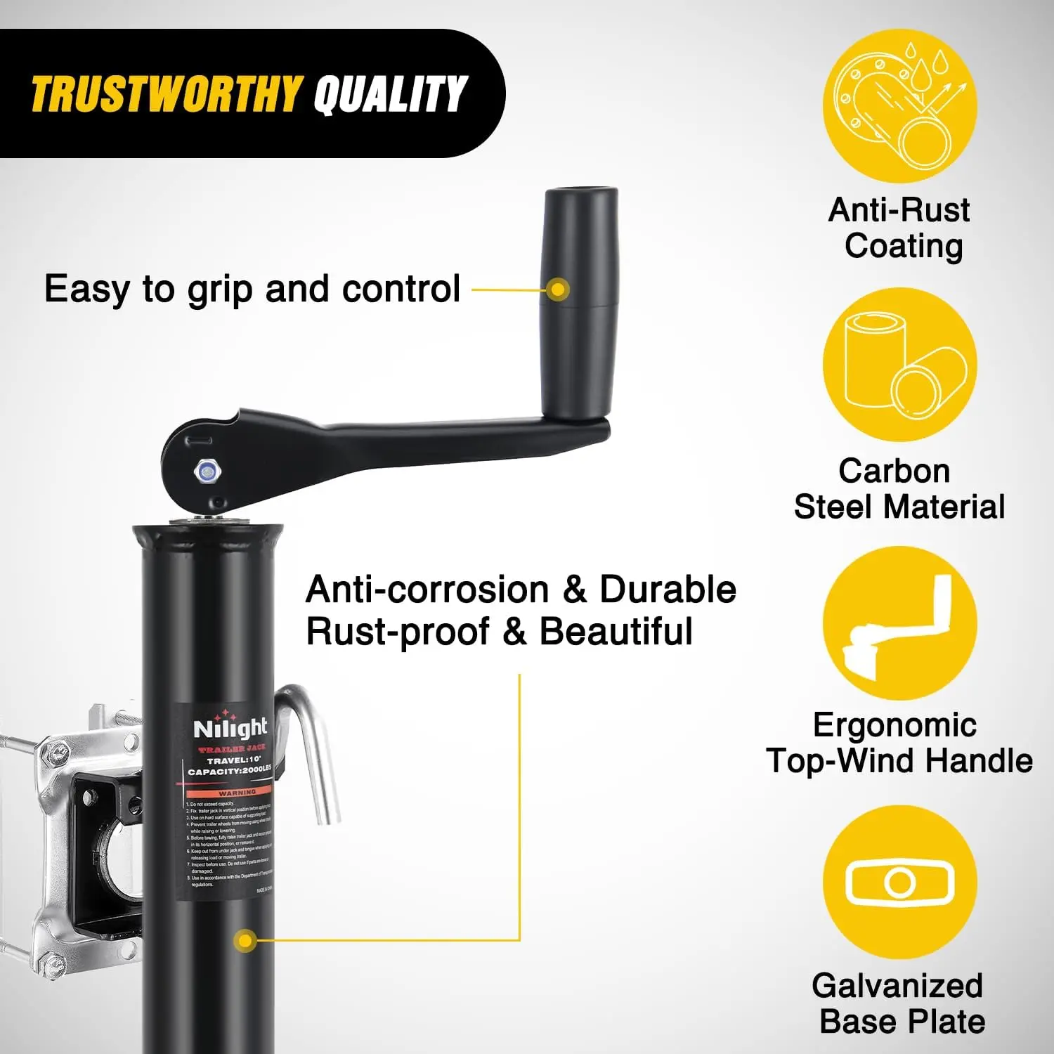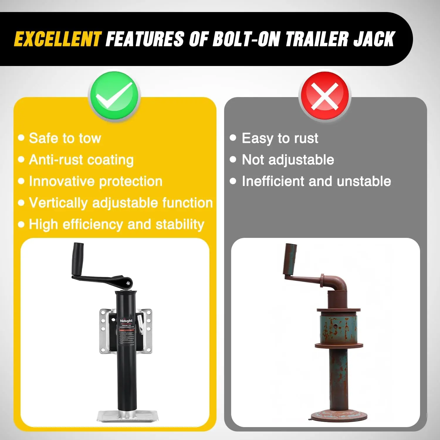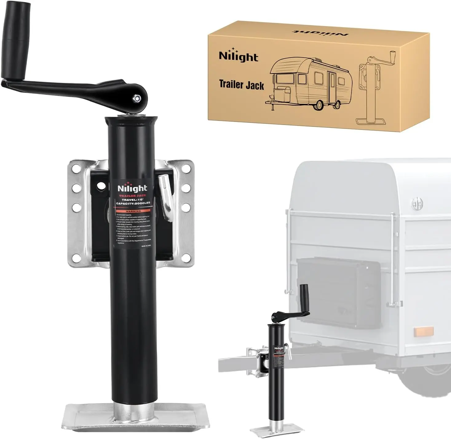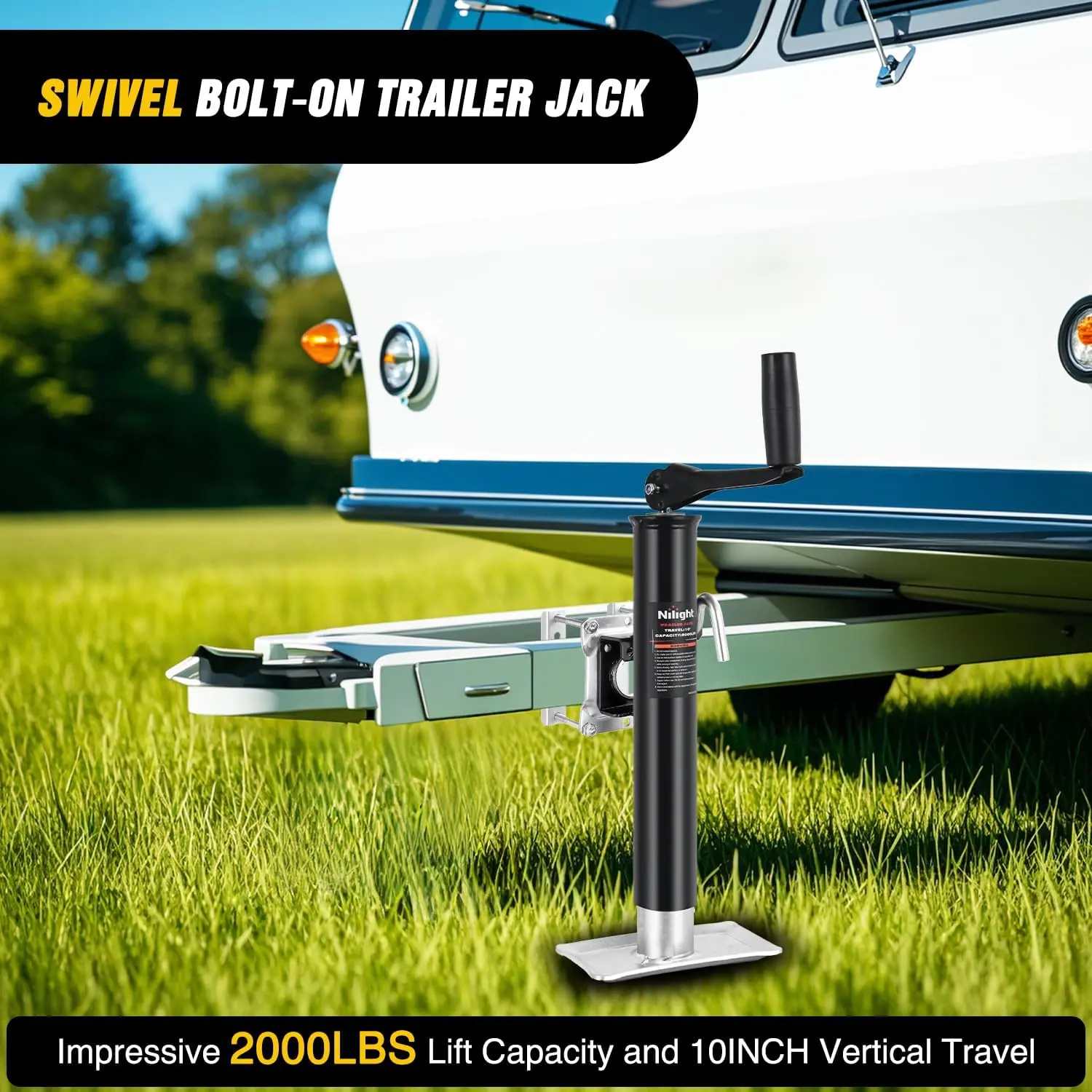 ·HEAVY-DUTY TRAILER JACK: Engineered for vehicles workloads, Nilight Bolt on trailer jack delivers a 2,000lbs lifting capacity, making it ideal for RV, boat, trailers, and heavy-duty equipment. Compatible with a variety of vehicles, meeting professional and home needs