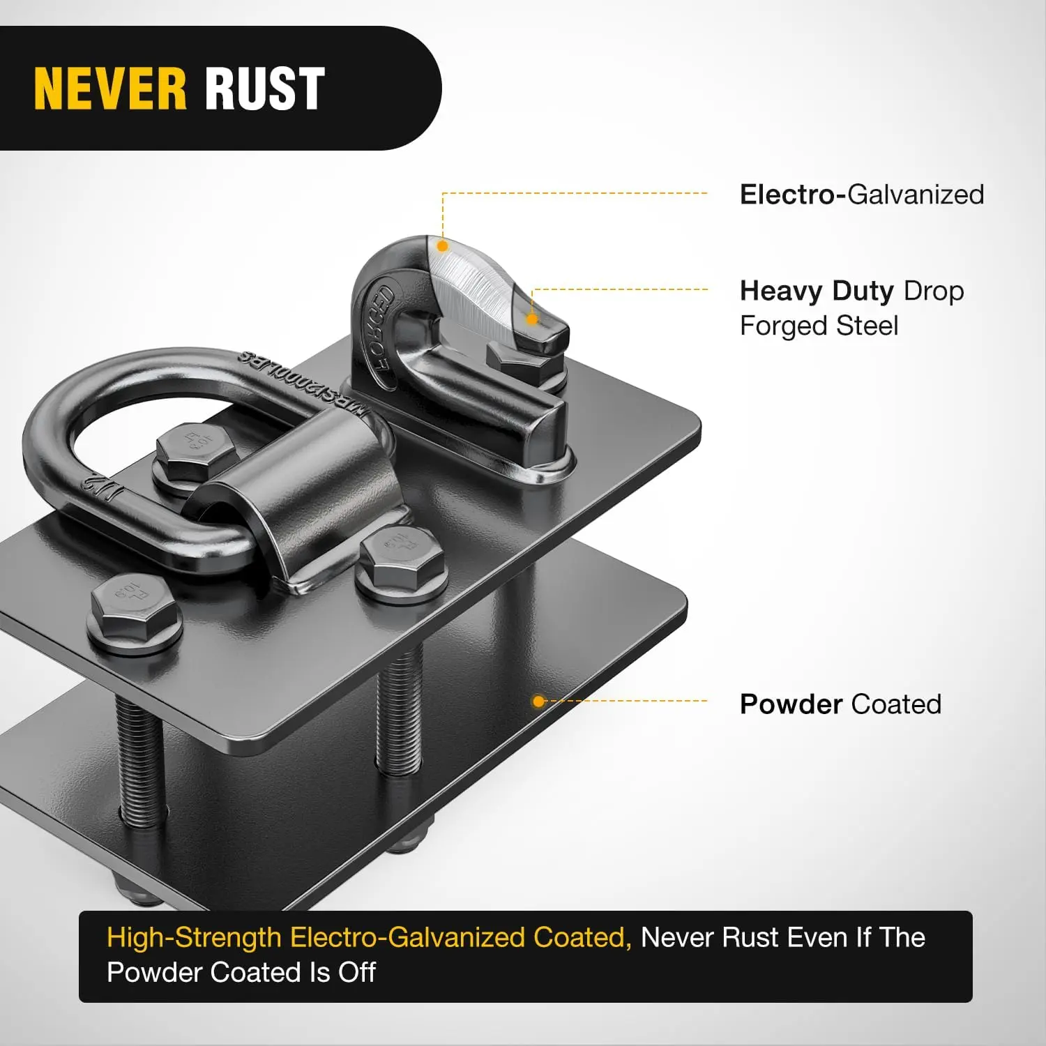 ·【Excellent Material】:Select high strength carbon steel material, after high temperature forging to increase tensile strength, make the product more safe, the surface after galvanizing and spray treatment, improve anti-corrosion, wear-resistant strength, provides durable and strong protection against the hardest of conditions.