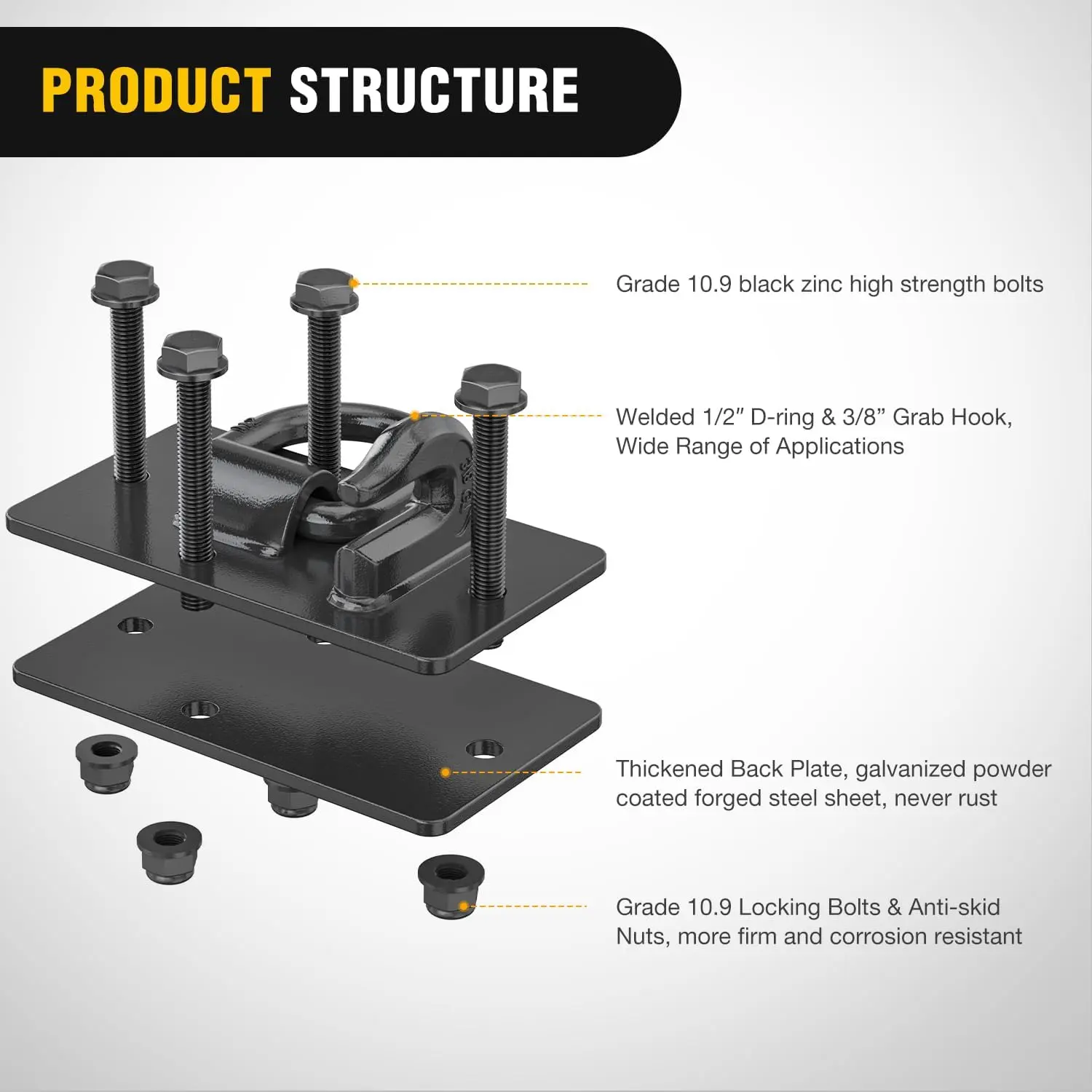 ·【Excellent Material】:Select high strength carbon steel material, after high temperature forging to increase tensile strength, make the product more safe, the surface after galvanizing and spray treatment, improve anti-corrosion, wear-resistant strength, provides durable and strong protection against the hardest of conditions.