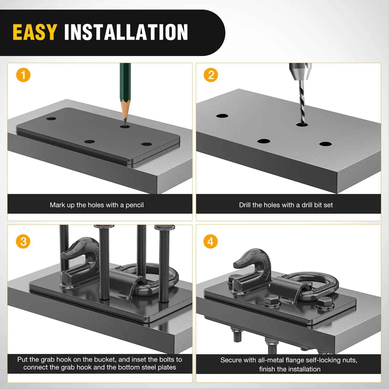 ·【Easy Installation】-Bolt-on Grab Hook coming with complete hardware for Installation, you can fix the grab hook on your machine with grade 10.9 locking bolts and lock anti-skid nuts easily.