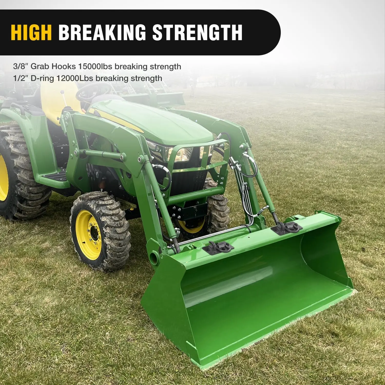 ·【Application】-Tractor Bucket Hooks fit for almost agricultural vehicle, such as John-Deere Truck, Tractor Bucket, Lawn Mowers, RV, UTV, ATV; Mounted on Tractor Bucket, used with chains, straps, ropes, and Ratchet Binders etc. It can also Used As Tow Hooks, is a Good Tractor Bucket Attachments.