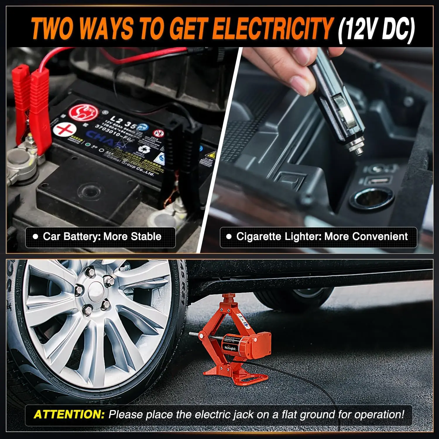 ·TWO WAYS TO CHARGE- Nilight 3 ton scissor jack for car can be charged through a 12V cigarette lighter or car battery. The kit comes with a 12-foot power cord, which is long enough to connect to the electric jack placed on the front or rear wheels, ensuring that you will not lose power no matter where your vehicle is.