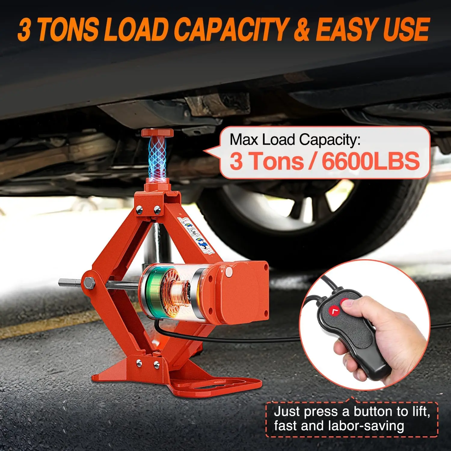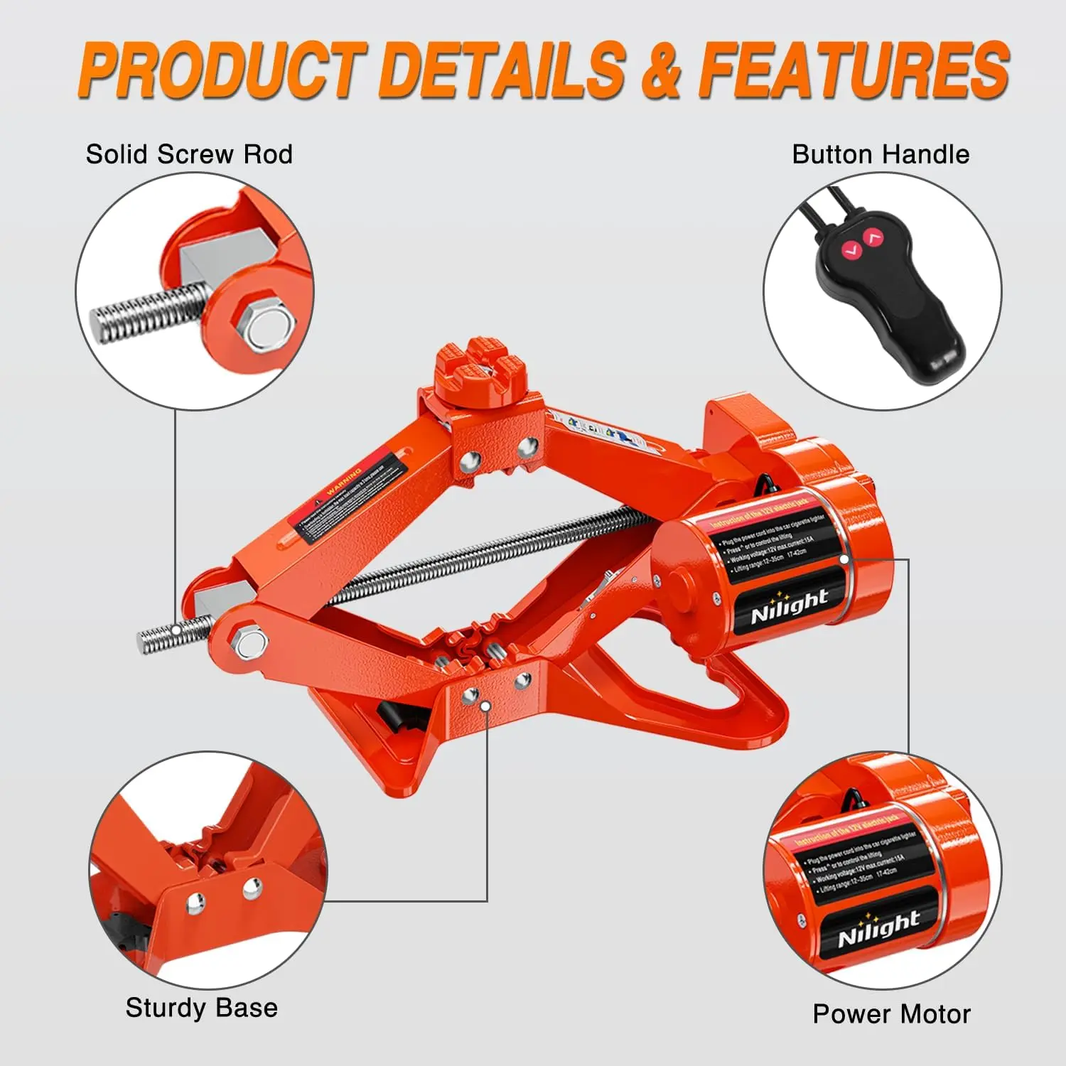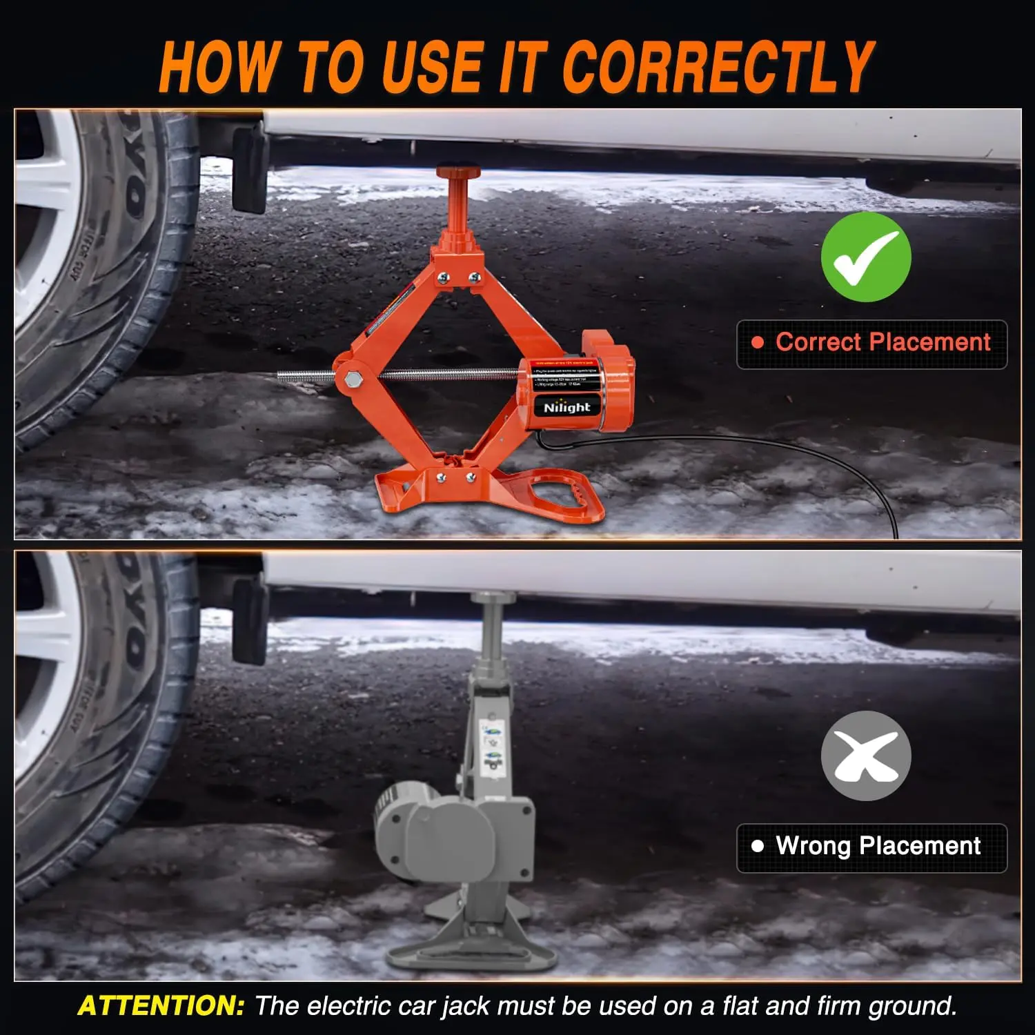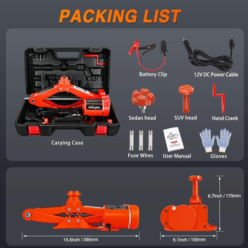 ·POWERFUL ELECTRIC JACK- Nilight electric scissor car jack has a lifting capacity of 3 tons, it can easily and quickly lift the car. The lifting range of the electric jack is 4.7”-13.8”/ 6.7”-16.5”, which is a well height to lift the car to change the tire. NOTE: Please place the electric jack on a flat ground for operation!