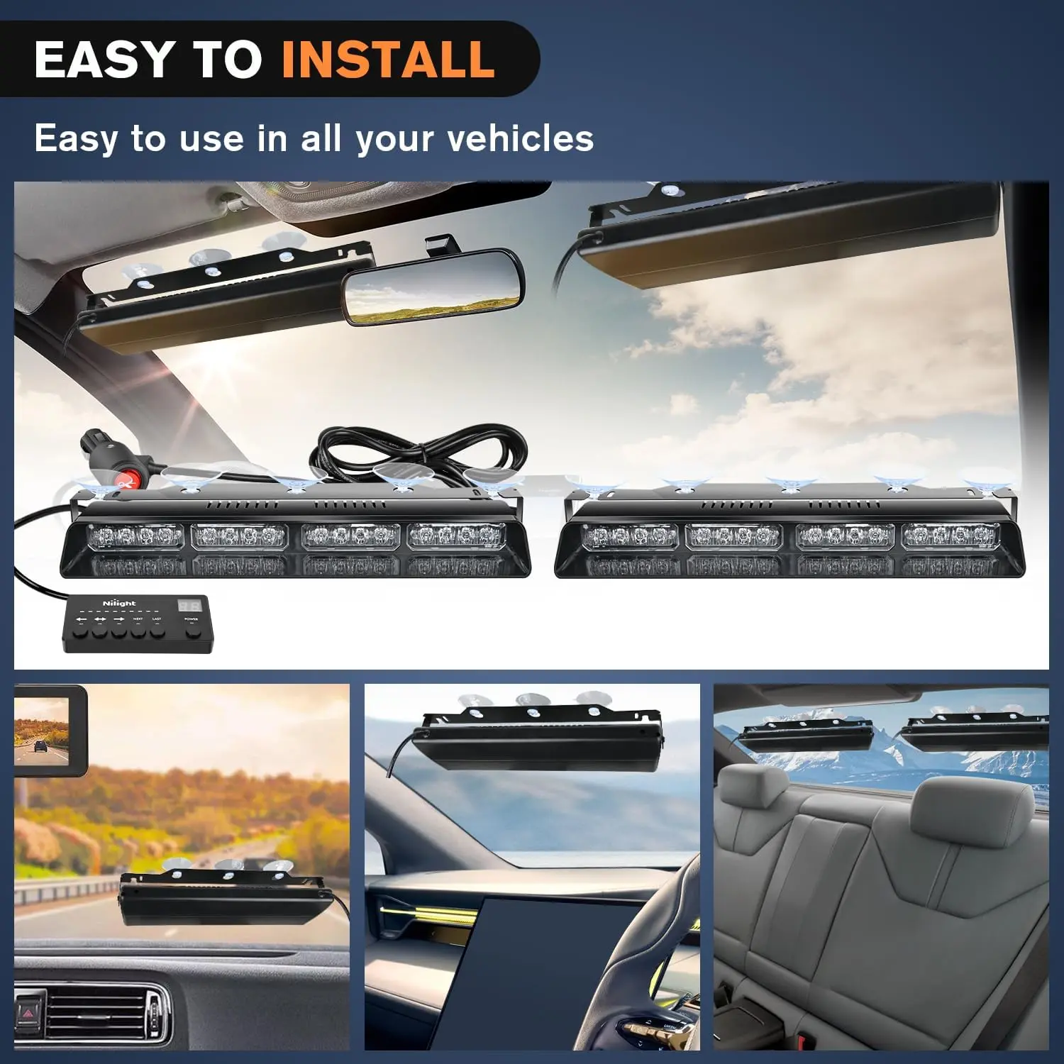 ·Easy installation: The strobe light comes with an adjustable bracket and 10 suction cups that can be mounted on the front windshield, rear windshield or instrument panel without drilling. The suction cups are strong enough to hold the lights in place and are easy to use on all vehicles without tools. The length of the wire between the light and the light is 4.9FT, the length of the wire between the light and the cigarette lighter is 3.3FT, and the length of the wire between the light and the controller is 12.8FT.