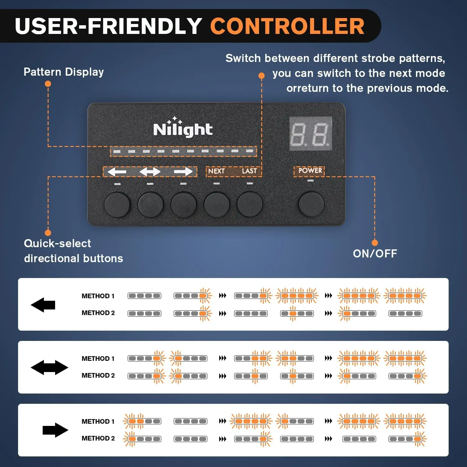 ·Flashing Patterns: Choose from 26 different flicker modes, just plug in the 12V cigarette lighter switch, you can control the desired strobe mode through the display handle, including steady on, alternating blinking, fast blinking, etc. It also has a memory function, and can still use the mode before closing after re-opening.
