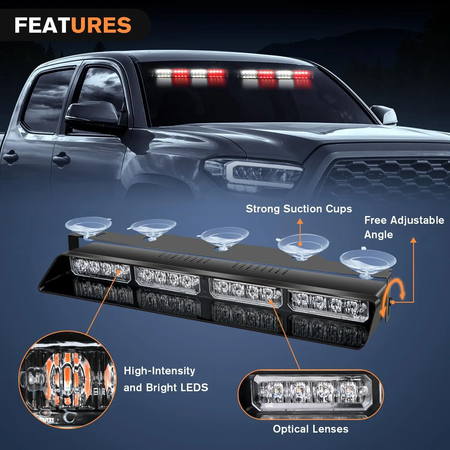 ·Easy installation: The strobe light comes with an adjustable bracket and 10 suction cups that can be mounted on the front windshield, rear windshield or instrument panel without drilling. The suction cups are strong enough to hold the lights in place and are easy to use on all vehicles without tools. The length of the wire between the light and the light is 4.9FT, the length of the wire between the light and the cigarette lighter is 3.3FT, and the length of the wire between the light and the controller is 12.8FT.