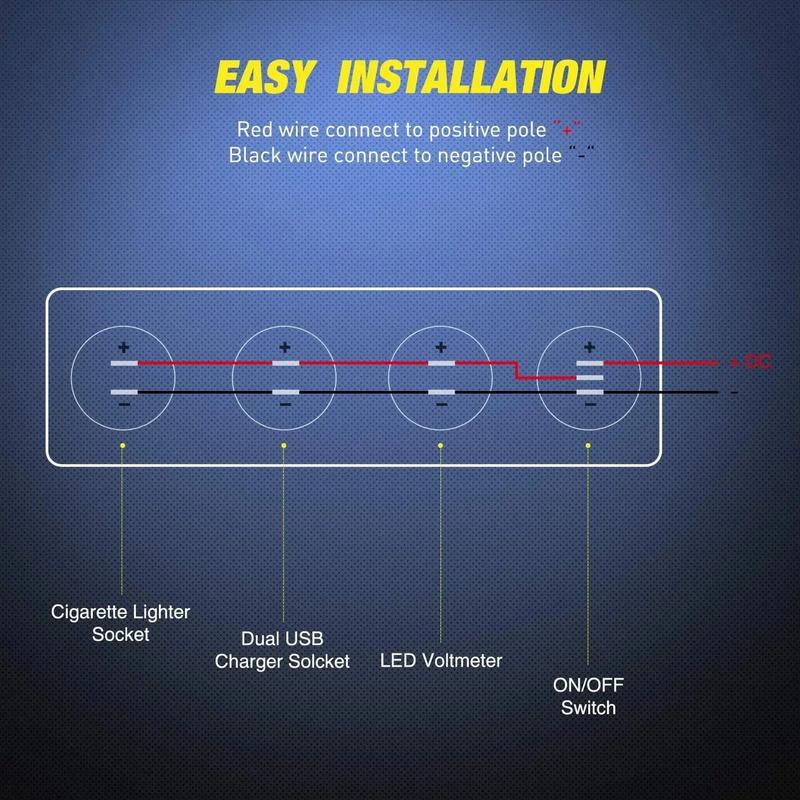 ·4in 1 DIY Toggle Switch Panel: Dual USB Socket + Voltmeter + 12V Outlet + ON/OFF Toggle Switch. It’s convenient for installing and operating. Also detachable to replace other charger sockets or anything else that fits.
