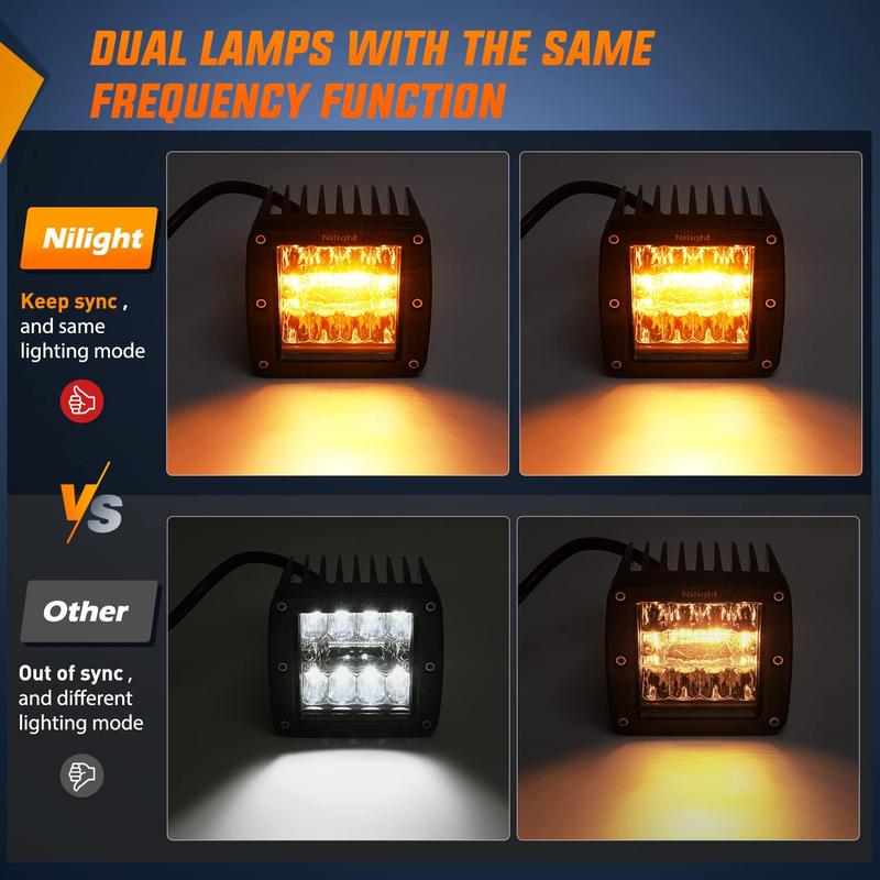 ·6 Modes with Memory Function: Regulate mode in turn by switch of the lights(white/amber/white & amber/white strobe/amber strobe/ white & amber strobe). The light pod will remember the mode you last used, you won't be annoyed by switch-mode frequently. It's great to use for warning lights, fog lights, driving lights, or work lights. Come with NILIGHT upgraded version wiring harness kit