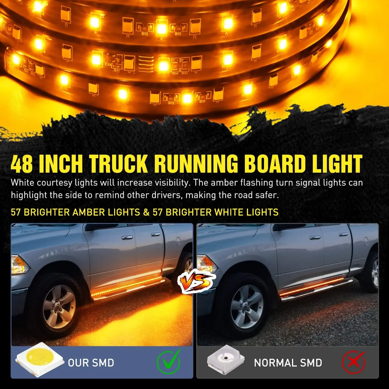 The 60inch running board lights includes 144pcs high intensity LED chips, amazing super bright lighting output,it is powered by 57 LEDs of white for door/step/DRL/parking lights and 57 LEDs of amber color for sequential turn signal lights.