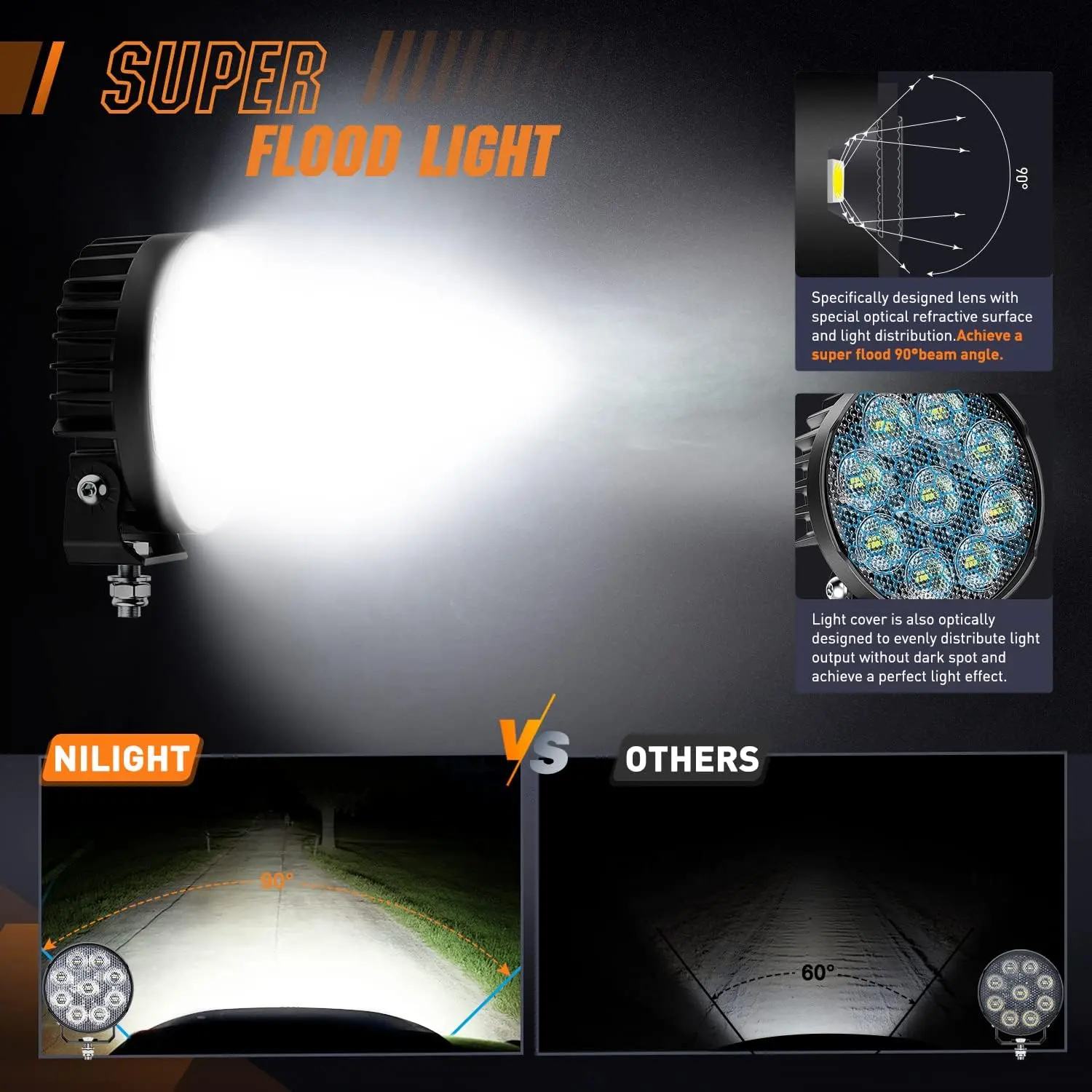 ·90°Super Flood Beam Angle: Use customized lens and light cover with perfect optical refractive surface design and light distribution theory for this light, achieving its beam angle into a 90°super flood and light output into an even super brightness