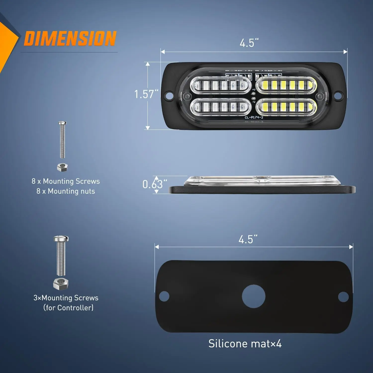·package include:4x double raw 24LED Flashing Lights,1x Main Control Box,1x control switch,4x Rubber Mats,1x Double-sided sticker(For Switch),1x Power wire,1x cigarette lighter plug ,8x Mounting Screws&8x Mounting nuts,3x Mounting Screws(for controller) , A Instruction Manual