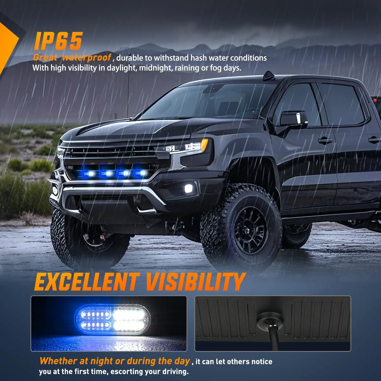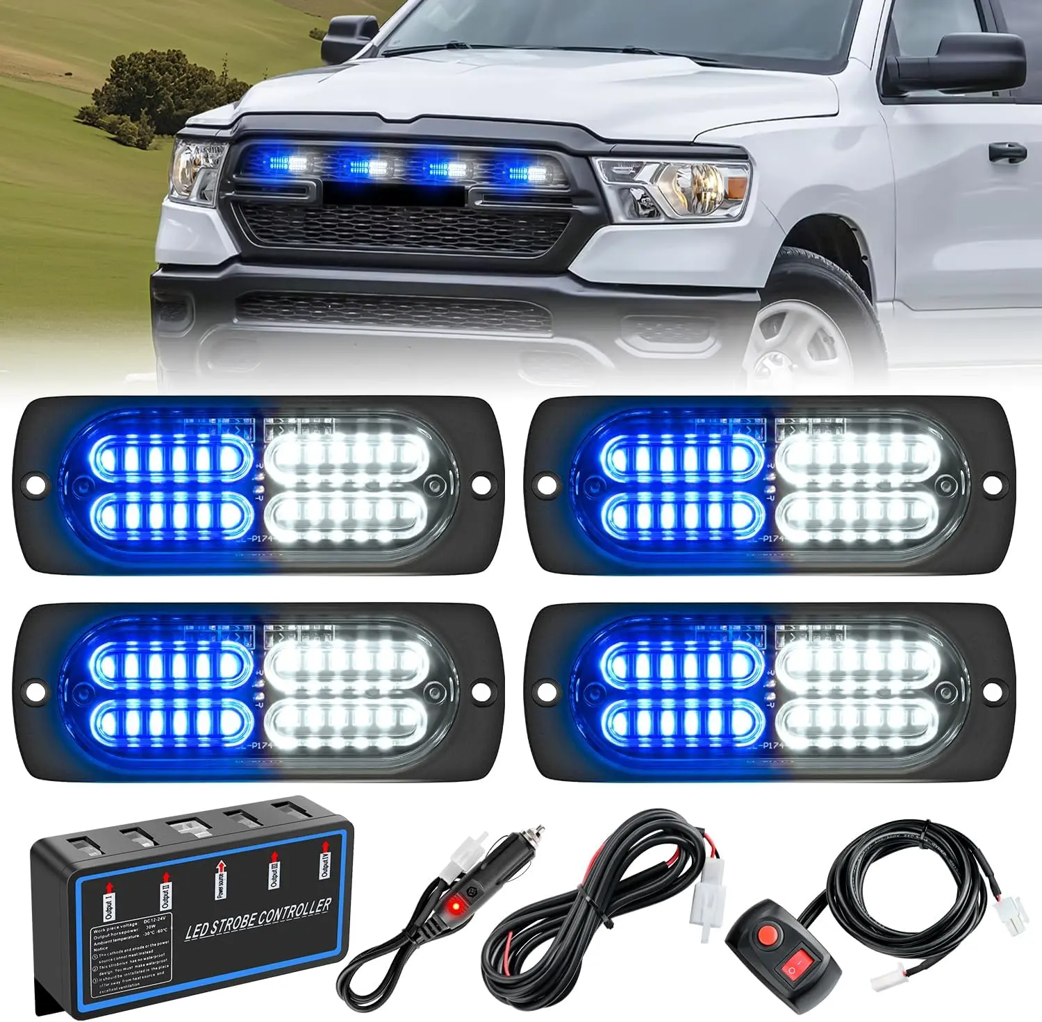 ·Super Bright:4Pcs Surface Mount Blue White Strobe Lights are consists of 4pcs double row 24 LED chips, provided maximum illuminate coverage and be visible from greater distance. Visible in daylight, midnight, rainy, foggy or snow days