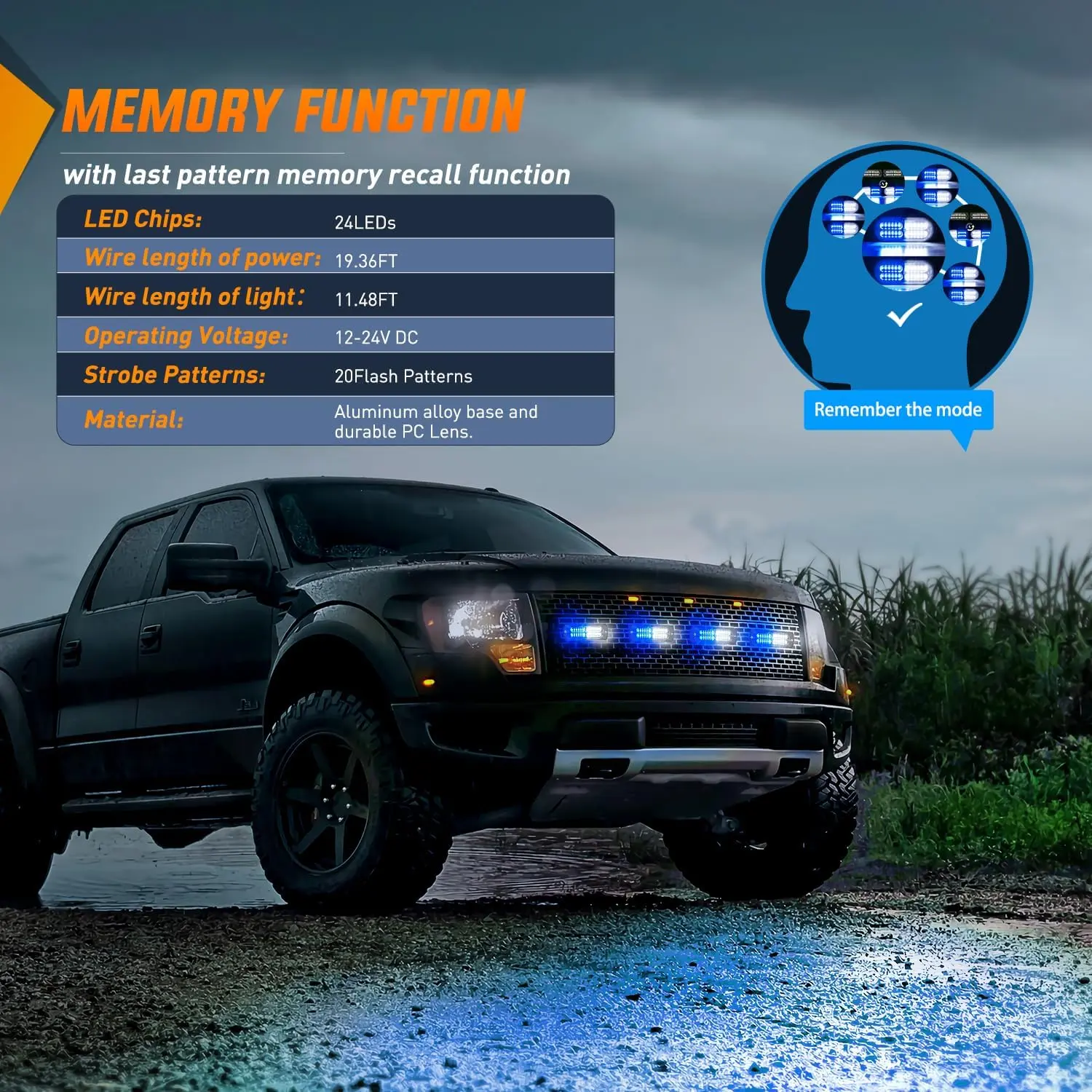 ·Flash Patterns: There are 20 flash patterns with a independent switch to cycle through modes. There are two buttons on the switch, one controls power on&off and one momentary switch change between 20different flash modes, includes last pattern memory recall. Patterns include regular flashing, synchronized flashing, quick flashing, etc