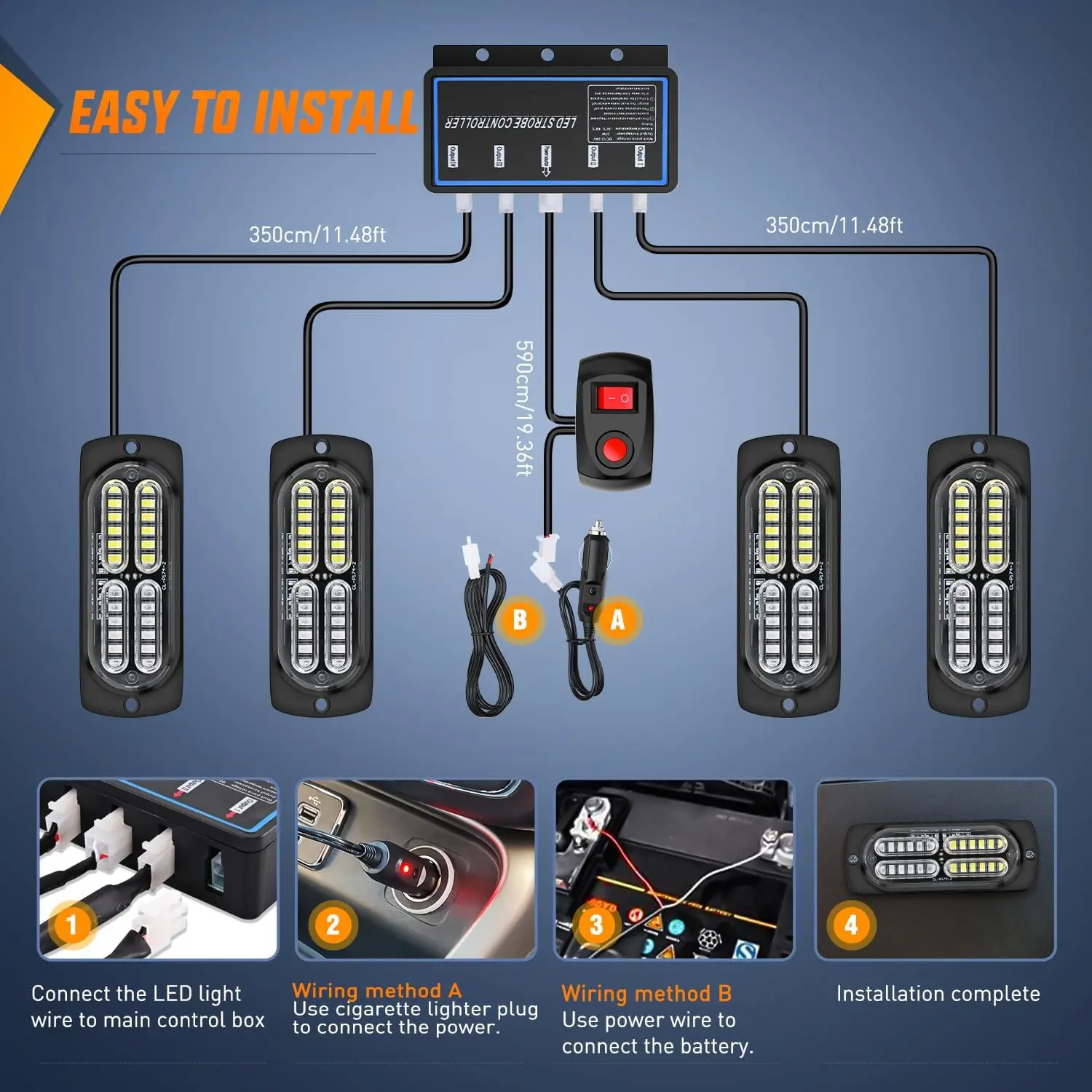 .This strobe lights can even be installed on Pickups, Heavy Trucks, Motorcycles, Emergency Vehicles as long as your car is 12V or 24V.