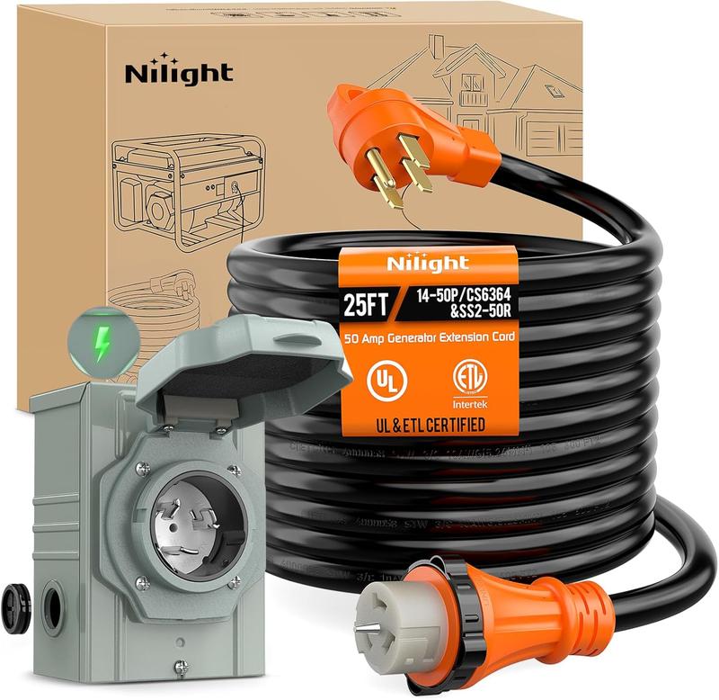 ·Package includes: 50 Amp RV 15 FT generator extension cord, 50 Amp Generator Power Inlet Box, drag tool and installation guidance.