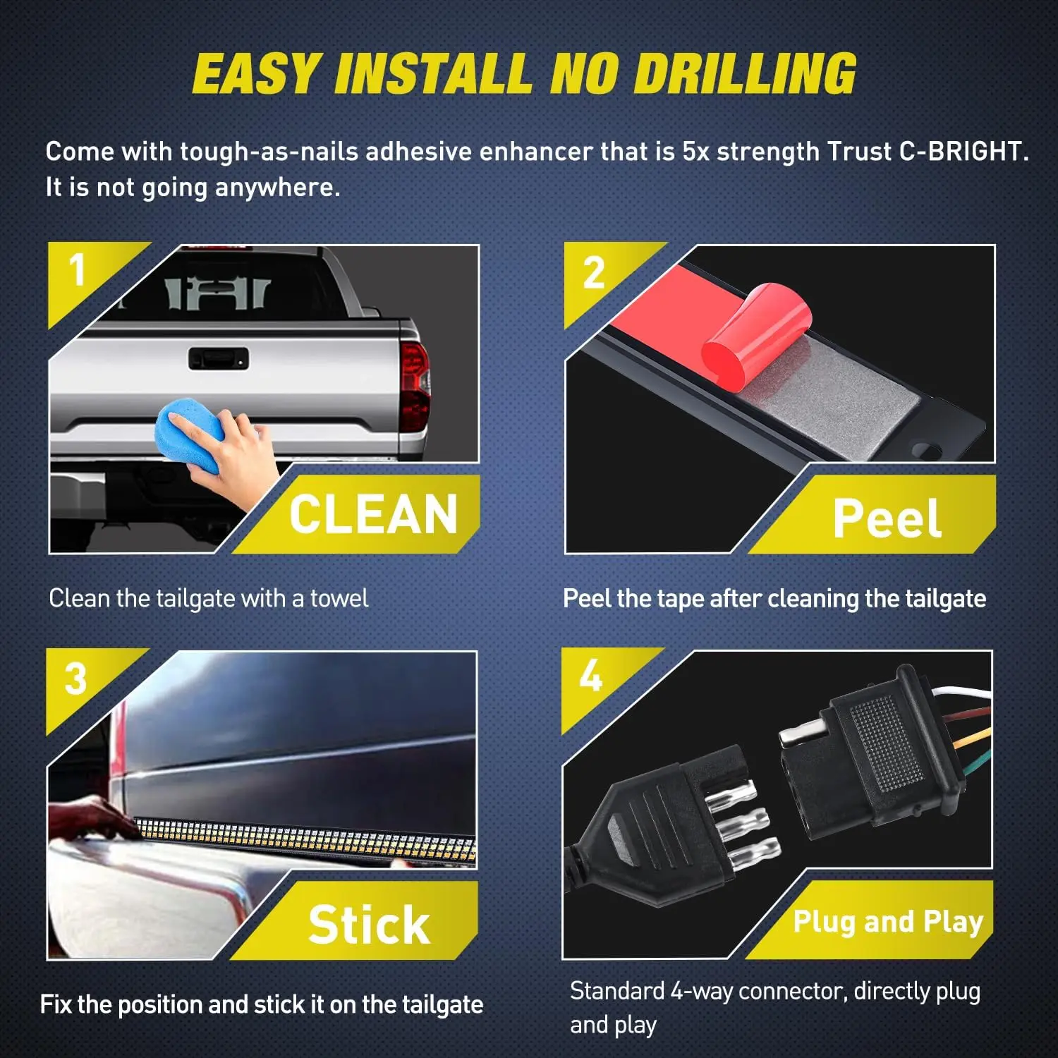 Come with a 4-Way Flat Connector Wire for different installation needs. You can also add on an additional mounts and screws to secure the light bar.