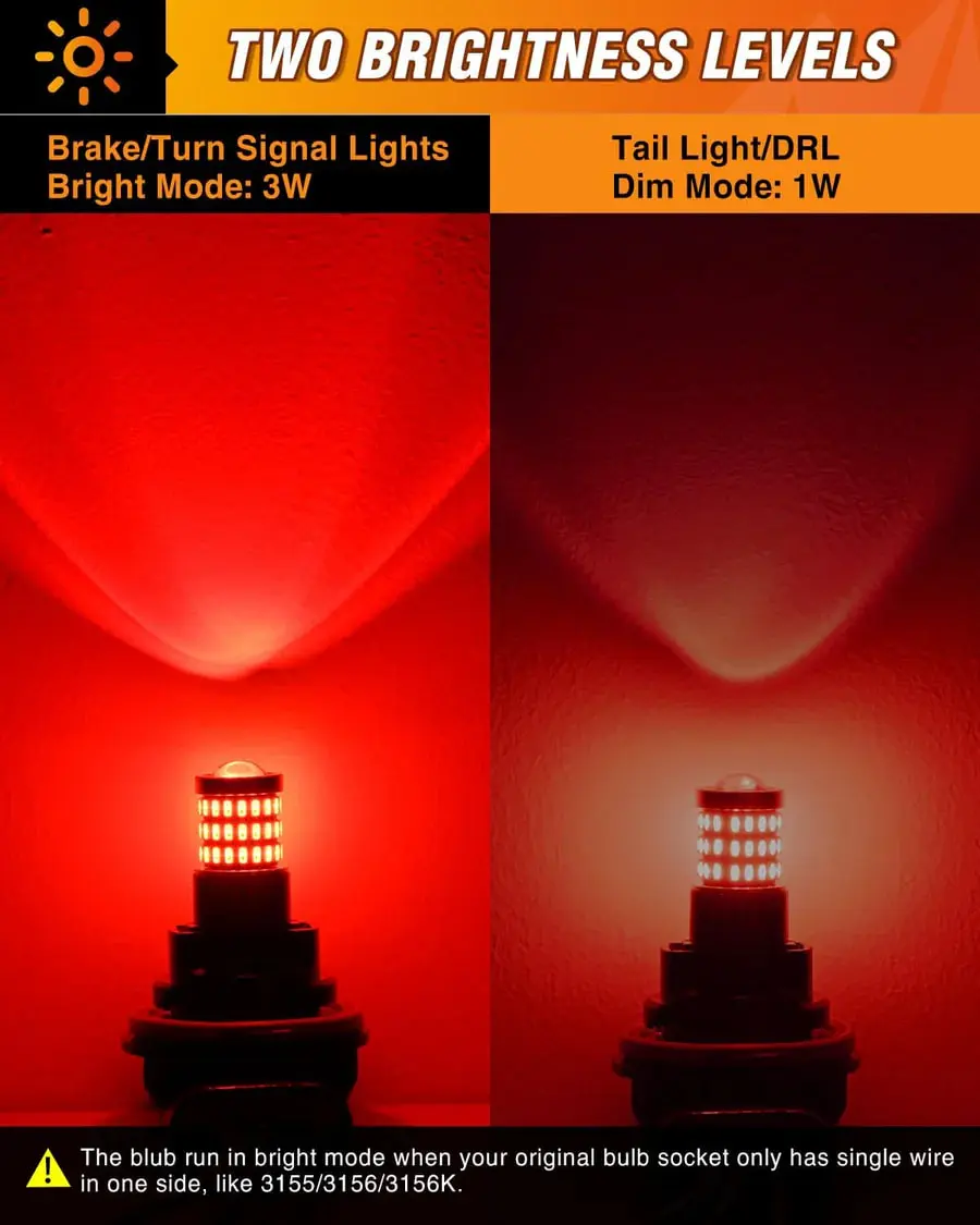 ·Wide Application: Perfectly work as Brake Stop Light, Turn Signals Blinker Light, Parking Light, Marker Light and Tail Light. LED bulbs have two brightness levels, with a high brightness of 3W and a low brightness of 1W. The blub run in bright mode when your original bulb socket only has single wire in one side, like 3155/3156/3156K
