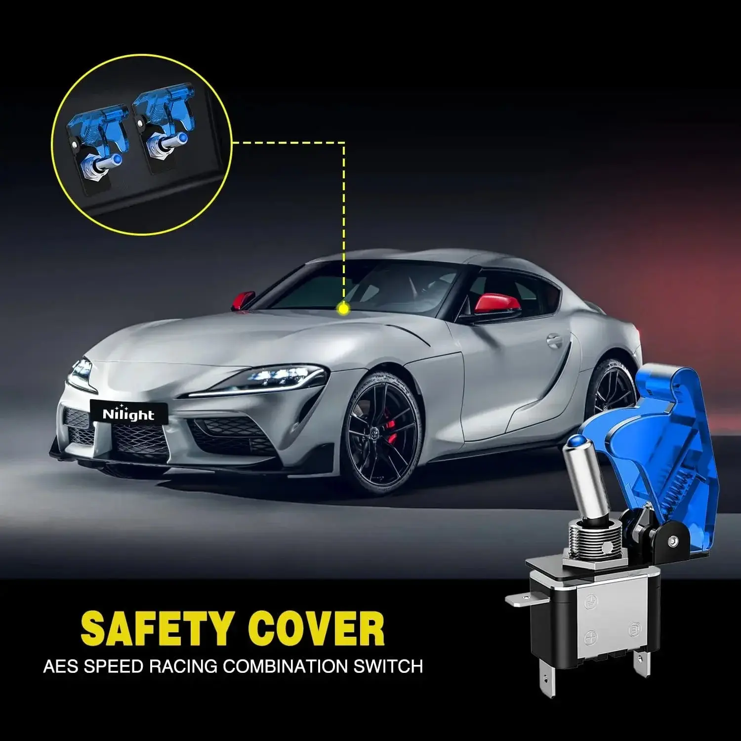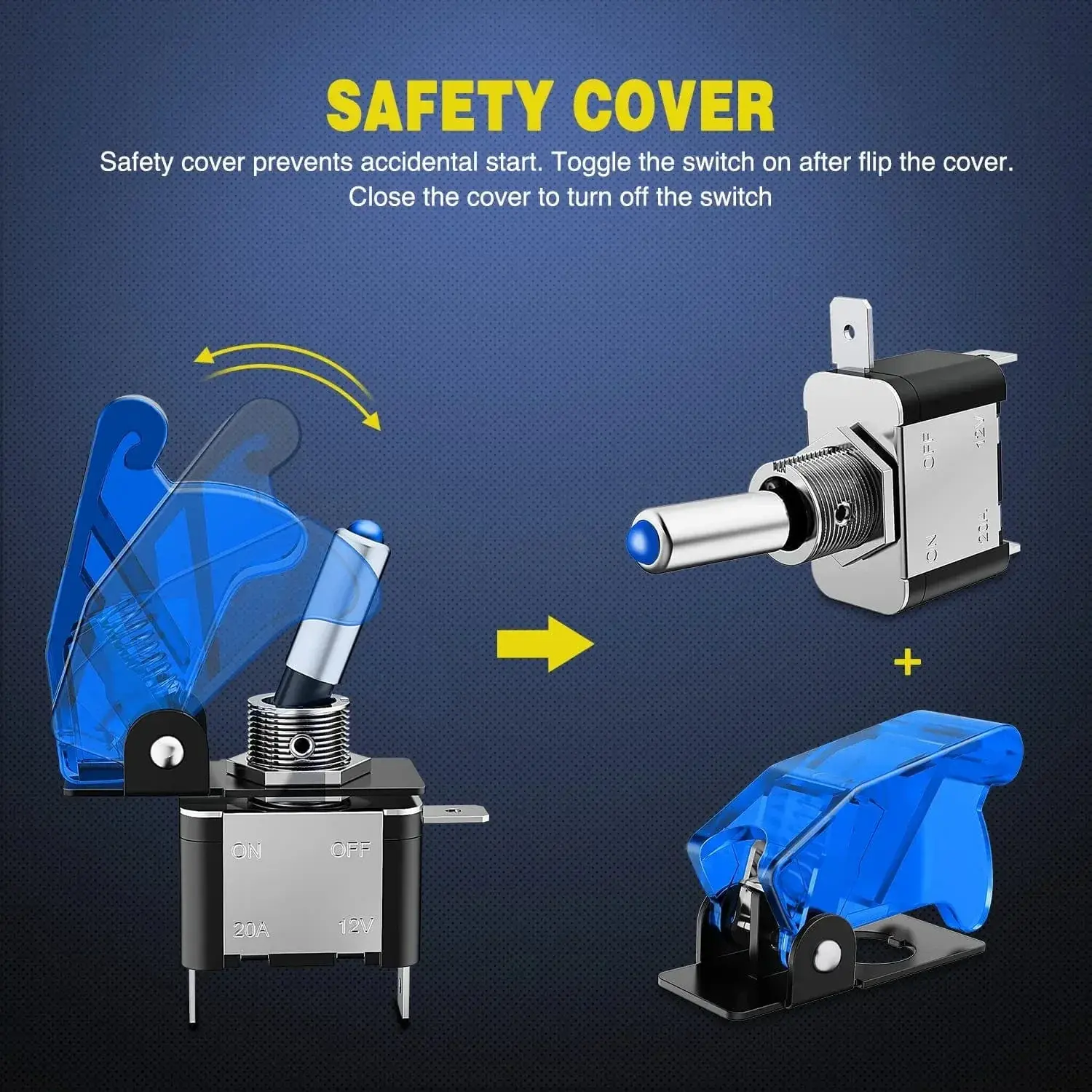 Safety cover: Transparent blue aircraft style safety cover prevents accidental start. The toggle switch can be turned on only after you flip the switch cover and toggle it to on position. And the switch get off automatically when you close the cover.