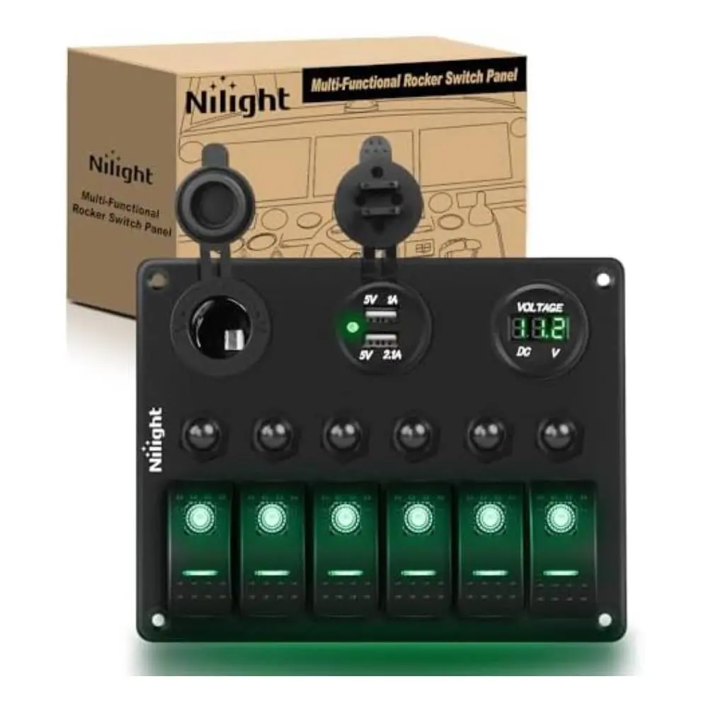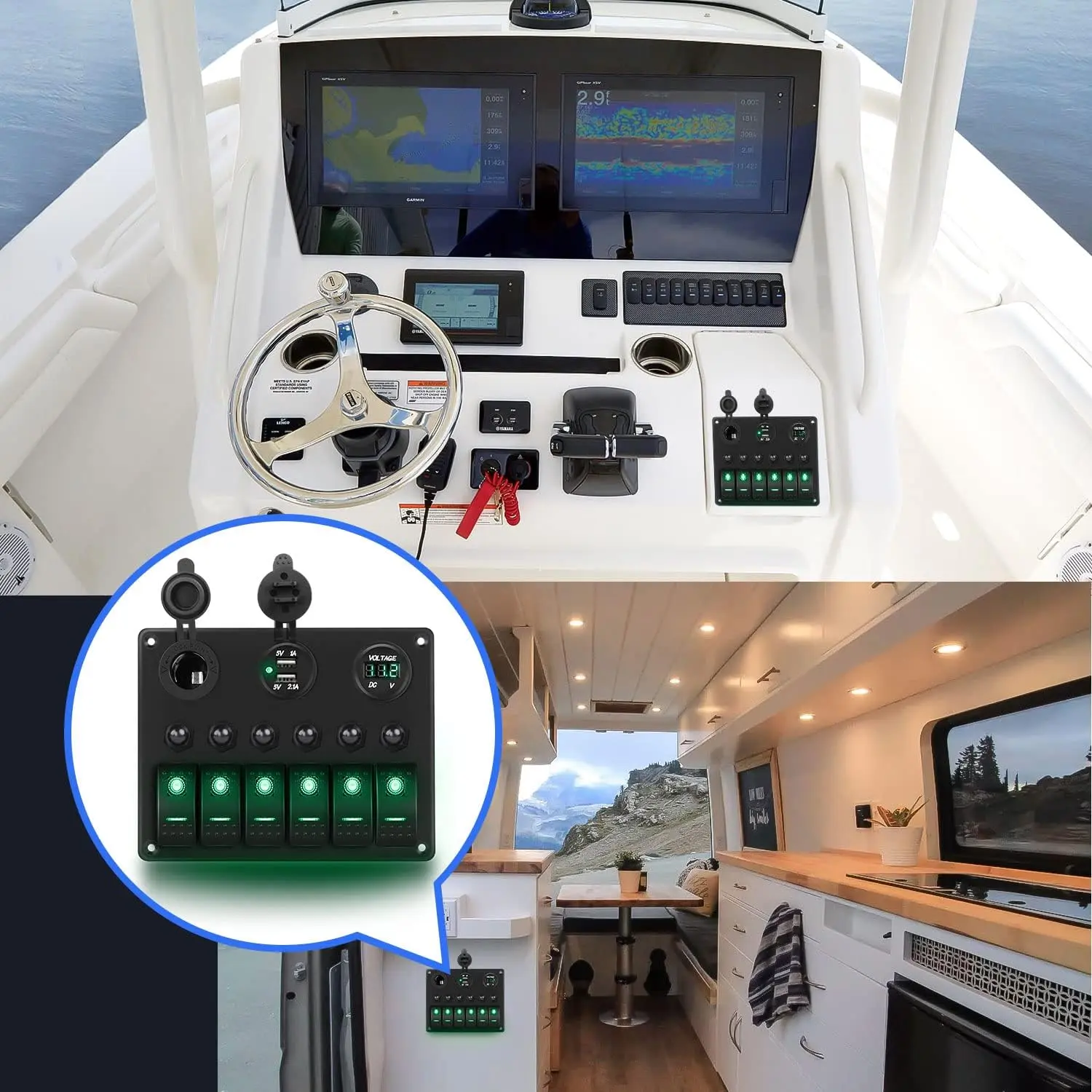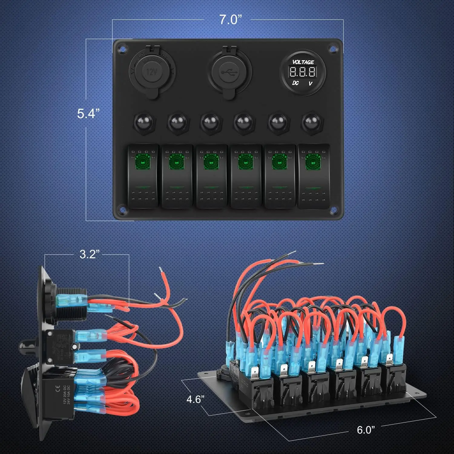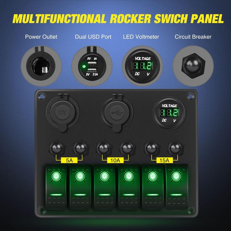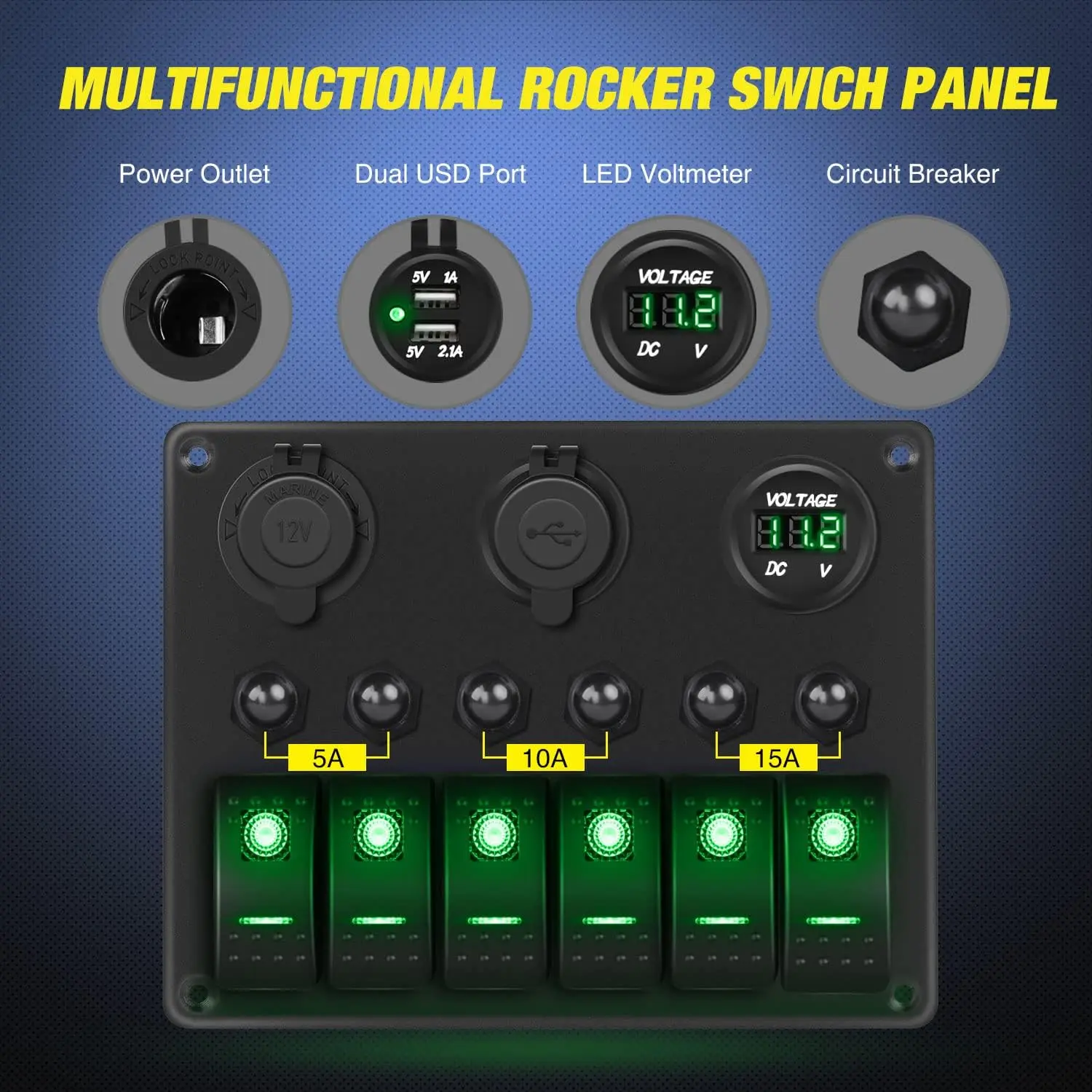 ·multi-function switch panel 6 on/off 5pin green led rocker switch 6 circuit breakers for overload protection 12v cigarette socket 5v/2.1a & 5v/1a dual USB charger port and digital voltmeter great for all types of circuit control charging needs and voltage monitoring