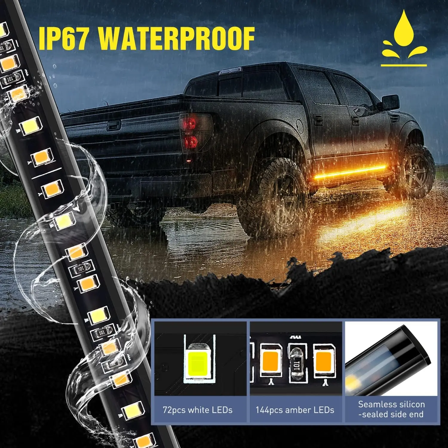 ·Impressive brightness: The 70inch running board lights includes 216pcs high intensity LED chips, amazing super bright lighting output,it is powered by 72 LEDs of white for door/step/DRL/parking lights and 144 LEDs of amber color for sequential turn signal lights
