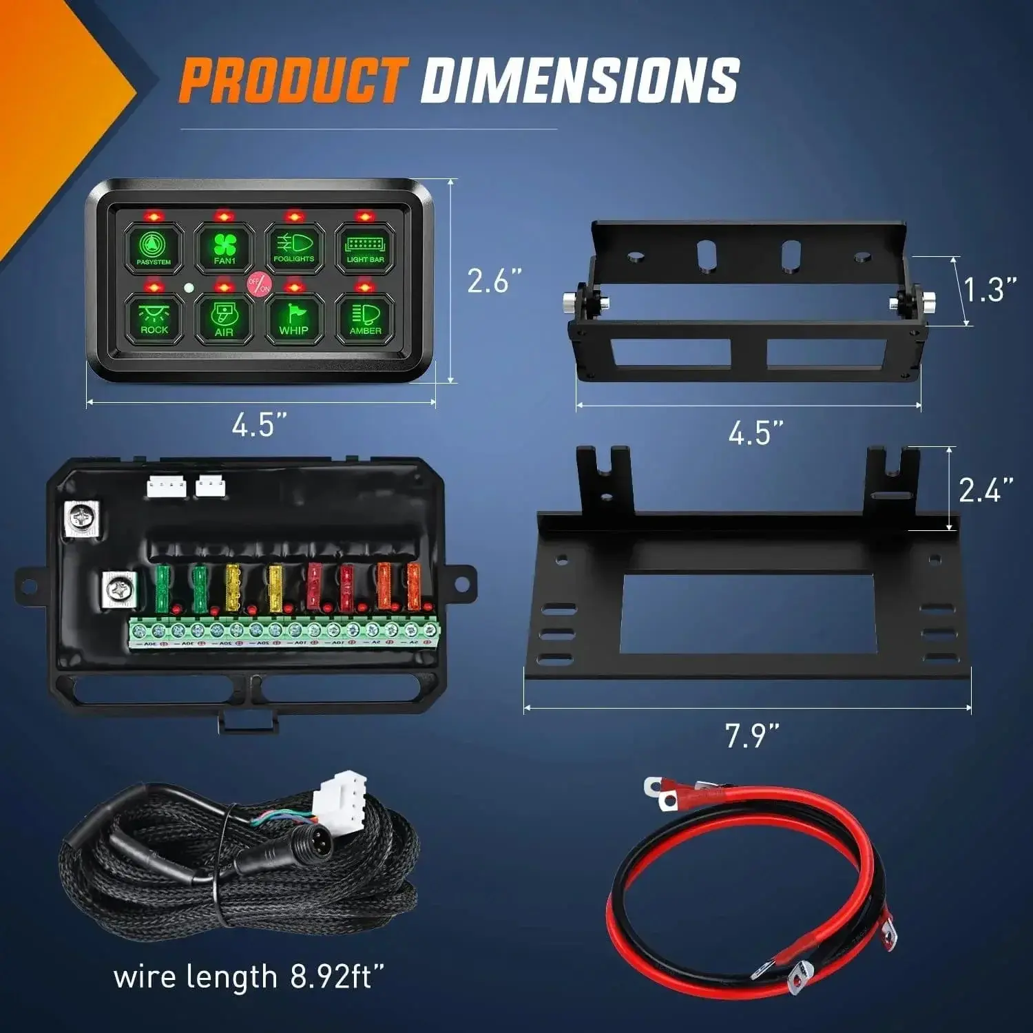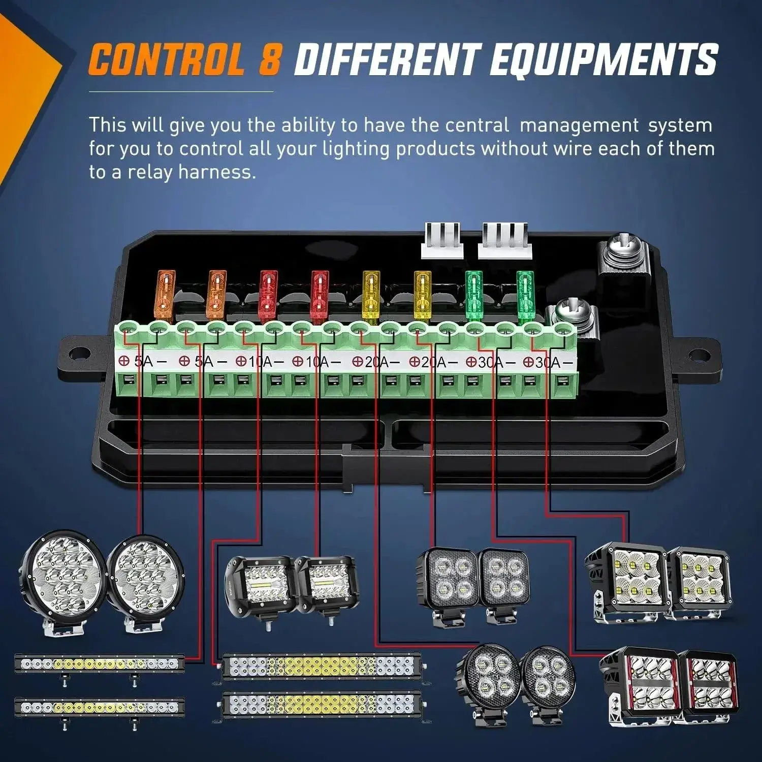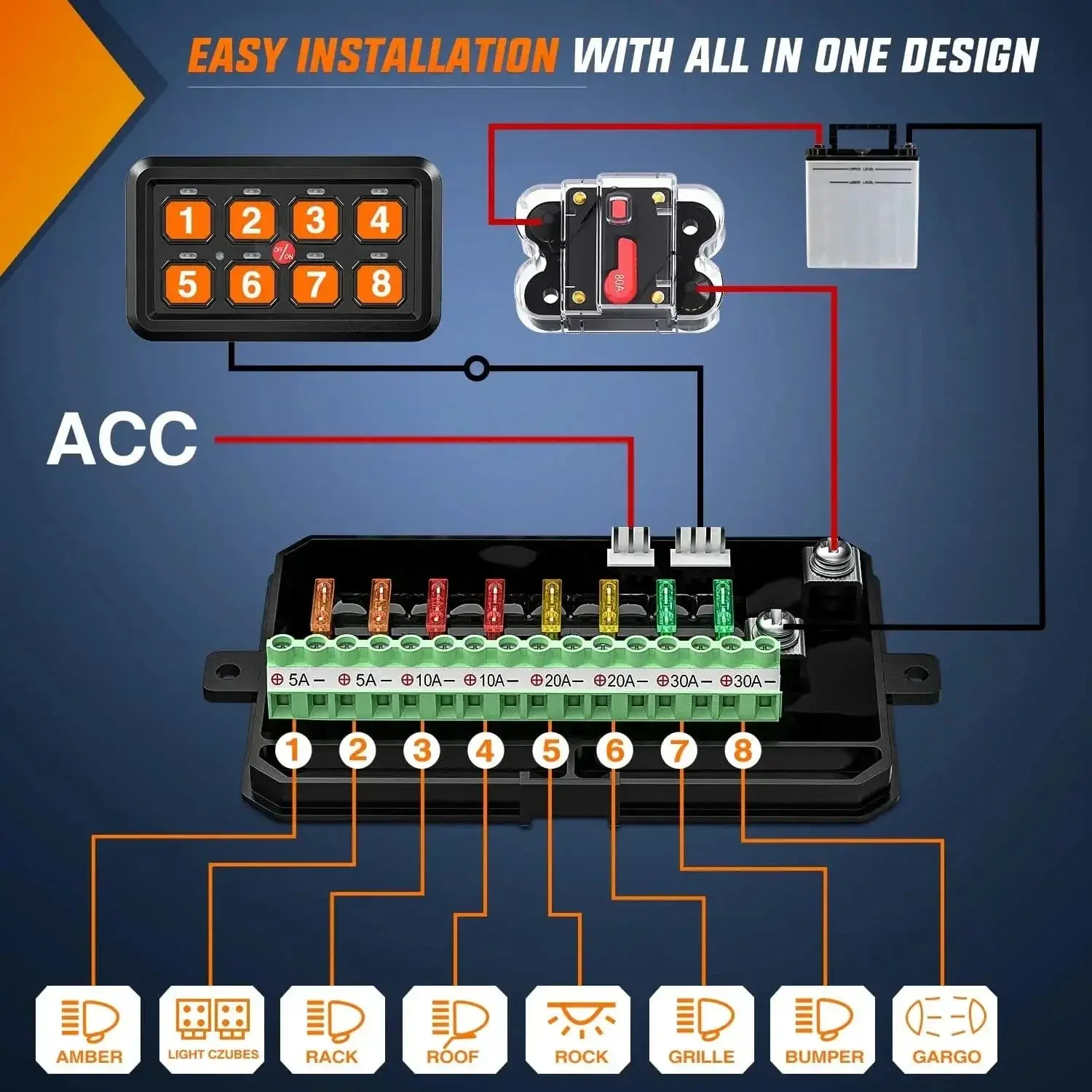 ·8 Gang Switch Panel System: Operating voltage: 12-24V DC, the max output power is rating at 1200 Watts. Allows you to control up to 8 different accessories at the same time. A perfect solution to clean up all messed up the wiring harness and control everything through a switch pod.