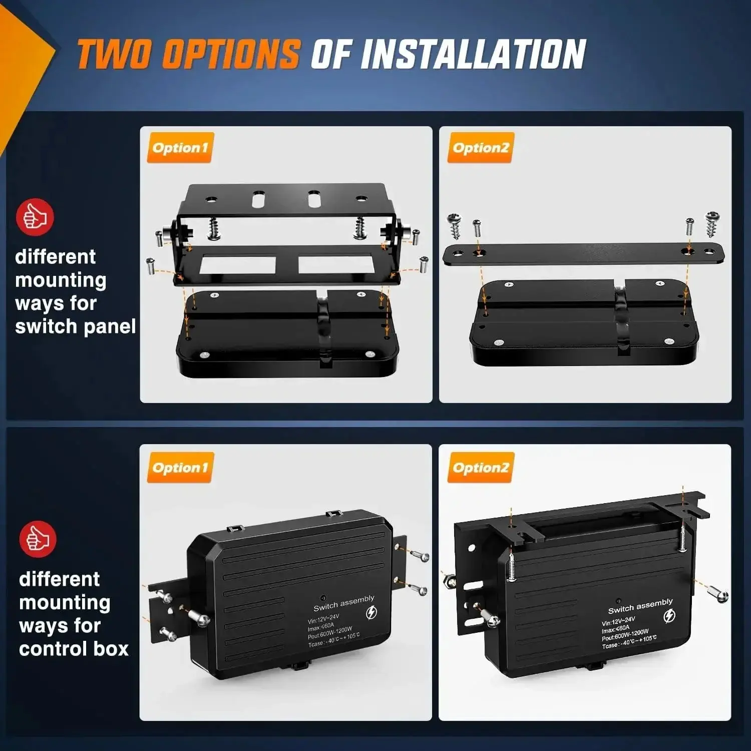 ·Safety Design: The switch box is equipped with an 80Amp circuit breaker, blade fuses, and high-power solid-state relays. Providing you with thermal protection, overload protection, over-voltage protection, and over-current protection. The Solid-state relays are built into the circuit control box, rather than being exposed as usual. Much compact, waterproof, and saves space.