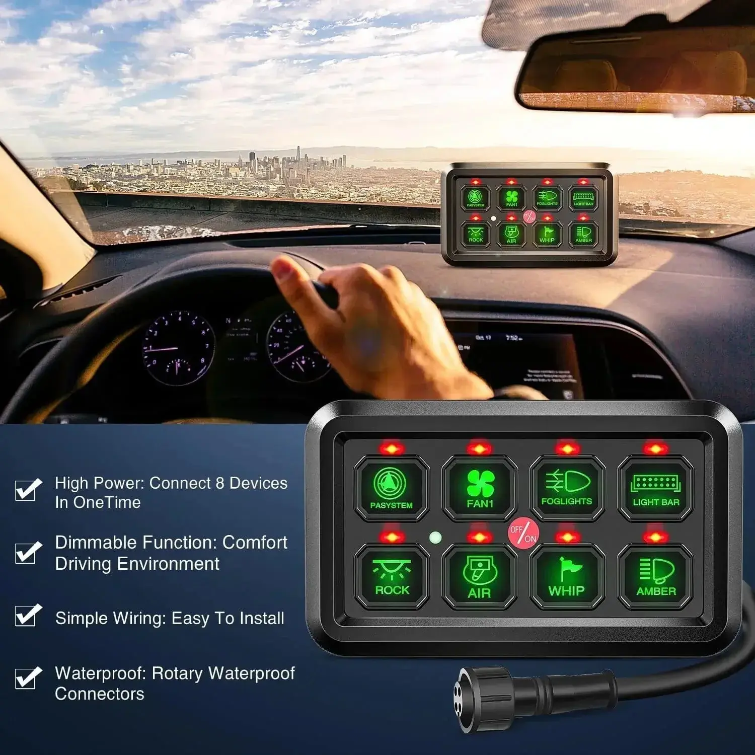 This switch panel allows you to control up to 8 different devices. The backlight of the switch panel will be automatically adjusted according to the brightness of the surrounding environment. Giving you a different user experience and ensuring your driving safety.